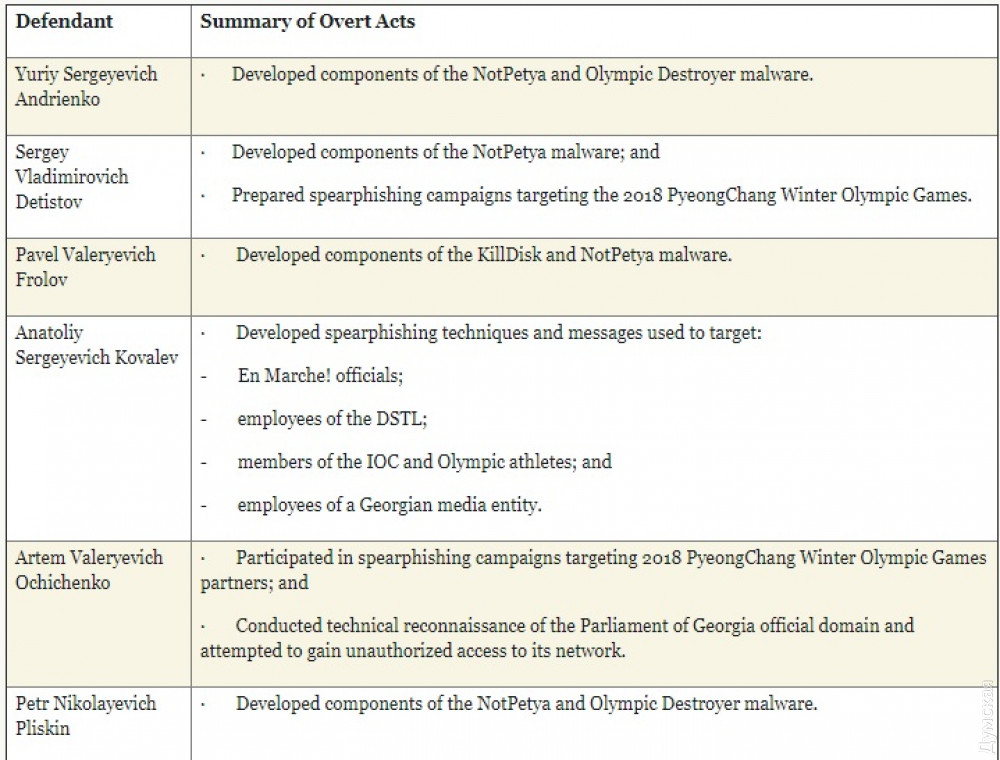 Трое из шести обвиняются в создании вируса NotPetya и других вредоносных программ. Детистов, Ковалев и Очиченко обвиняются в фишинговых атаках — создании фиктивных имейлов, призванных выведать пароли доступа у сотрудников организаций.
