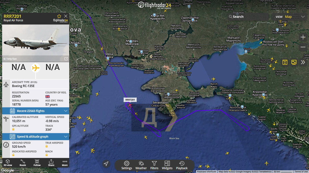 Взлетев с авиабазы Милденхолл и пройдя над Одессой, в 14:00 британский стратегический разведчик Boeing RC-135W Airseeker R1 вошел в небо над Черным морем.