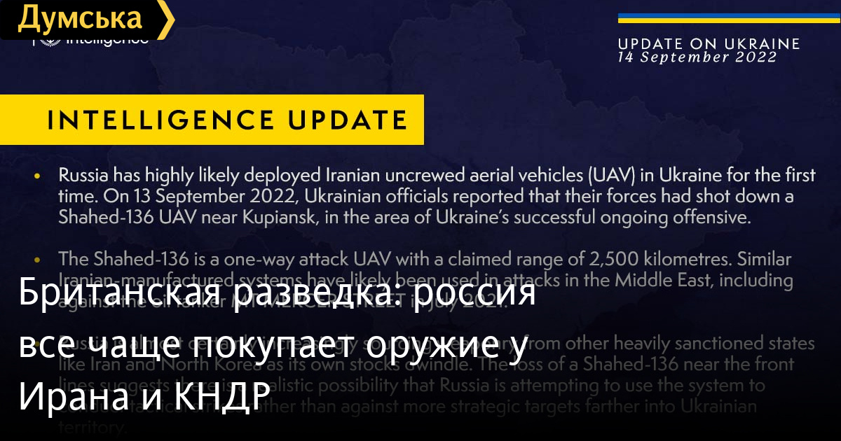 Британська розвідка: росія все частіше купує зброю в Ірану та КНДРРосії через нестачу власних запасів озброєння все частіше вдається до закупівлі зброї у підсанкційних держав, таких, як і Іран і Північна Корея. Про це повідомляє Секретна розвідувальна служба Великої Британії. У МІ6 підтвердили інформацію про те, що в районі Куп'янська українські воїни збили іранський ударний безпілотник Shahed-136. Такі БПЛА Іран раніше використав для атаки на ізраїльський танкер біля берегів Оману влітку 2021 року. СМЕРТЬ РОСІЙСЬКИМ ОКУПАНТАМ! Помітили помилку? Виділяйте слова з помилкою та натискайте control-enter |