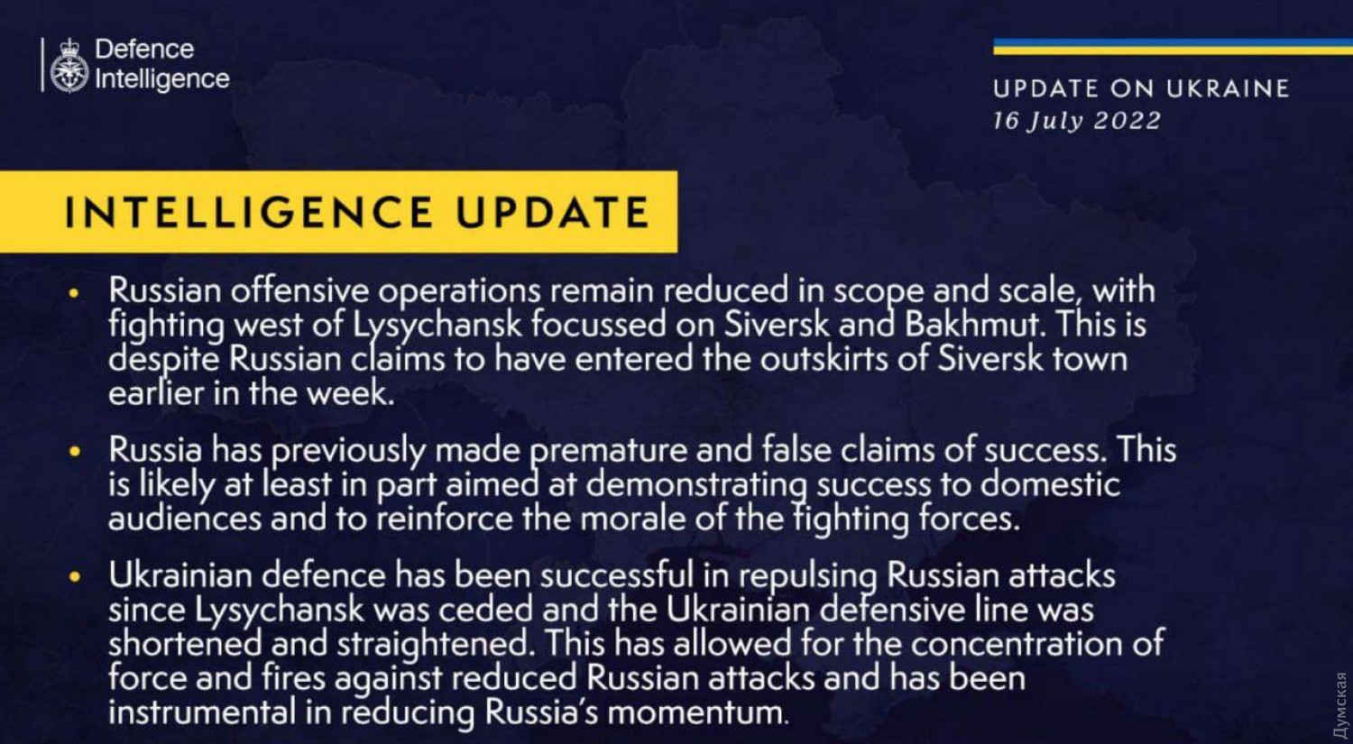 Британська розвідка: російський наступ обмежений за масштабом, окупанти не досягли успіху у СіверськуРоссийская армия пытается развить наступление в направлении Северска и Бахмута, но из-за нехватки войск их продвижения ограничены. Об этом сообщает разведка Великобритании. В ведомстве отметили, что заявления россиян о том, что им удалось зайти в Северск – не подтверждаются. Таким образом они пытаются укрепить боевой дух оккупационных войск. «Тем временем, после отхода из Лисичанска украинская оборона успешно отражала атаки россиян, изменения потерпела оборонительная линия Украины, что сыграло важную роль в уменьшении импульса рф», — отметили в разведке. СМЕРТЬ РОСІЙСЬКИМ ОКУПАНТАМ! Помітили помилку? Виділяйте слова з помилкою та натискайте control-enter |