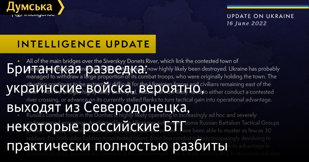 По данным ведомства, некоторые российские батальонно-тактические группы были практически полностью разбиты во время интенсивных боев. Так, при штатной численности в 600-800 солдат, в них осталось примерно по 30 военнослужащих.