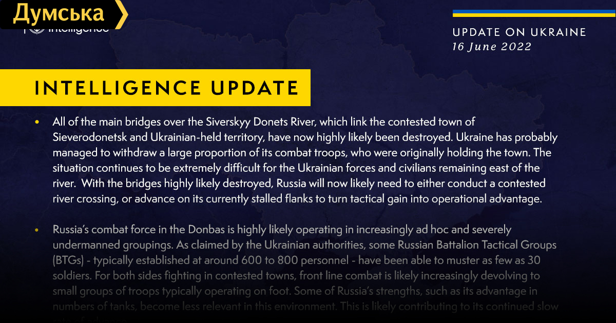 Британская разведка: украинские войска, вероятно, выходят из Северодонецка, некоторые российские БТГ практически полностью разбитыОккупантам удалось разрушить все три моста через Северский Донец, которые связывали Северодонецк с «большой землей». Несмотря на это, значительную часть украинских войск удалось вовремя отвести из осажденного города. Об этом сообщает разведка министерства обороны Великобритании. Поскольку мосты в Северодонецк рухнули, теперь для оккупантов особо актуальной становится задача форсирования Северского Донца. Напомним, раньше у них с этим особо хорошо не складывалось. По данным ведомства, некоторые российские батальонно-тактические группы были практически полностью разбиты во время интенсивных боев. Так, при штатной численности в 600-800 солдат, в них осталось примерно по 30 военнослужащих. Разведка отмечает, что бои на Донбассе сейчас ведутся преимущественно малыми группами войск, которые часто действуют в пешем порядке. В условии таких военных действий нивелируются некоторые преимущества российской армии. Так, например сейчас не играет значительной роли численное превосходство российских танков. Такой характер боев также способствует замедлению продвижения противника. СМЕРТЬ РОСІЙСЬКИМ ОКУПАНТАМ! Помітили помилку? Виділяйте слова з помилкою та натискайте control-enter |