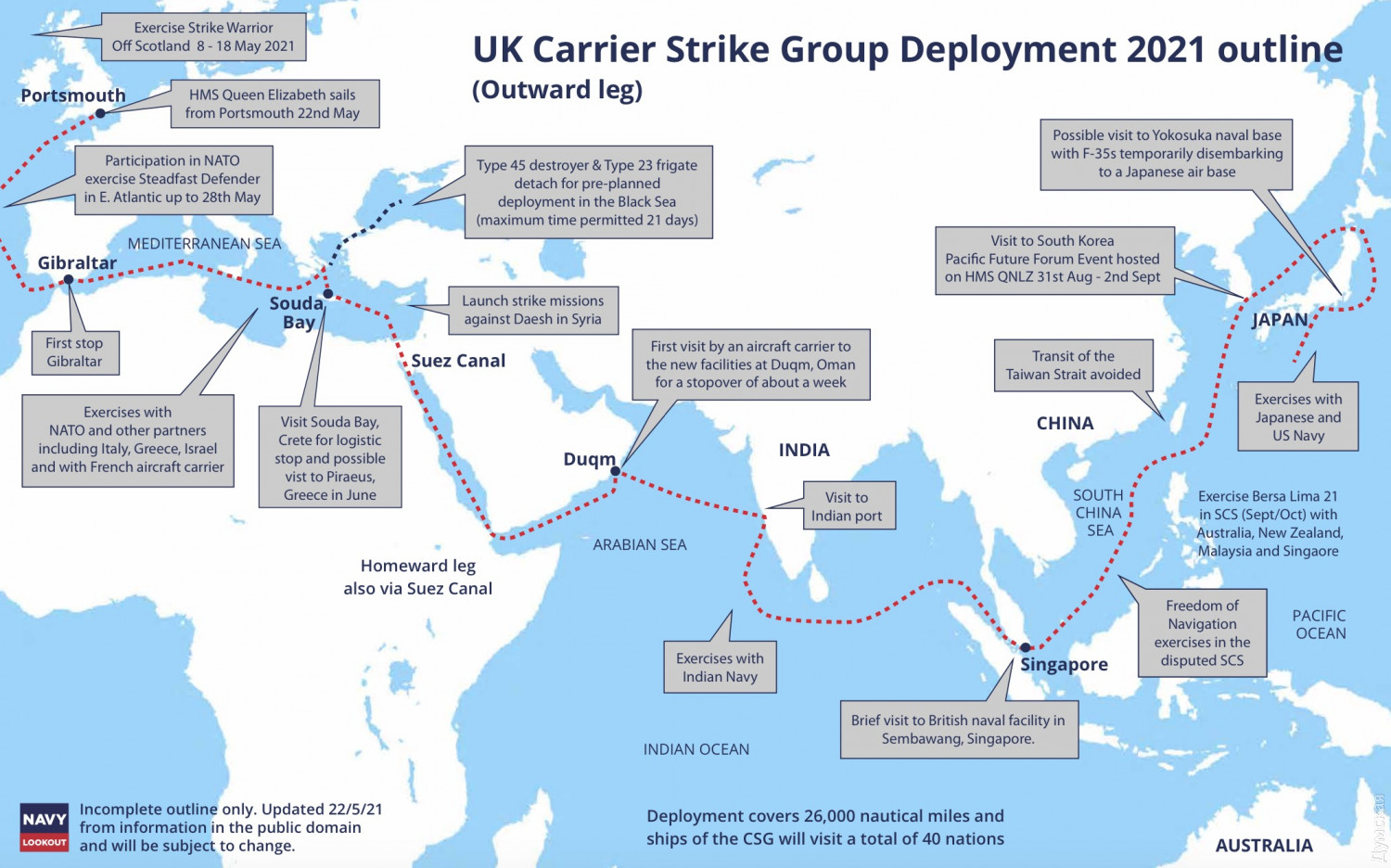 Далее через Суэцкий канал корабли пройдут Индийским океаном зайдут в Сингапур, затем морями бассейна Тихого океана дойдут до Японских островов. По пути авианосная группа будет участвовать в учениях с союзниками и партнерами.