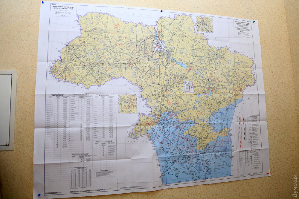 Молодые люди, сидящие в креслах, внимательно следят за экранами, на которых отображается воздушная обстановка. Неподготовленному гостю не понять, что именно здесь изображено: индикация состоит из хаотично пересекающихся прямых линий, непонятных значков, мелких букв, цифр и небольших резко очерченных зон. Все в монохромных оттенках зеленого. Если присмотреться, можно заметить мелкие светлые крестики, которые медленно движутся по дисплею рядом с двумя-тремя строчками из символов. Это и есть схематичное изображение самолетов, идущих в зоне ответственности центра — так называемом Одесском районе полетной информации. При более внимательном изучении индикатора можно заметить очень тонкие линии границ сопредельных государств, моря и суши, а также зон, запрещенных для полетов.