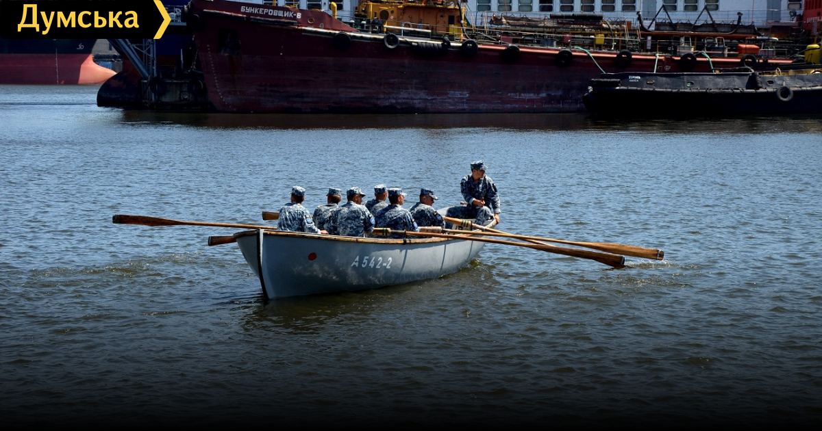 Первокурсники института военно-морских сил Одесской морской академии, будущие офицеры морской пехоты из Военной академии и курсанты отделения военной подготовки мореходного колледжа вышли в первый морской поход на шестивесельных ялах.