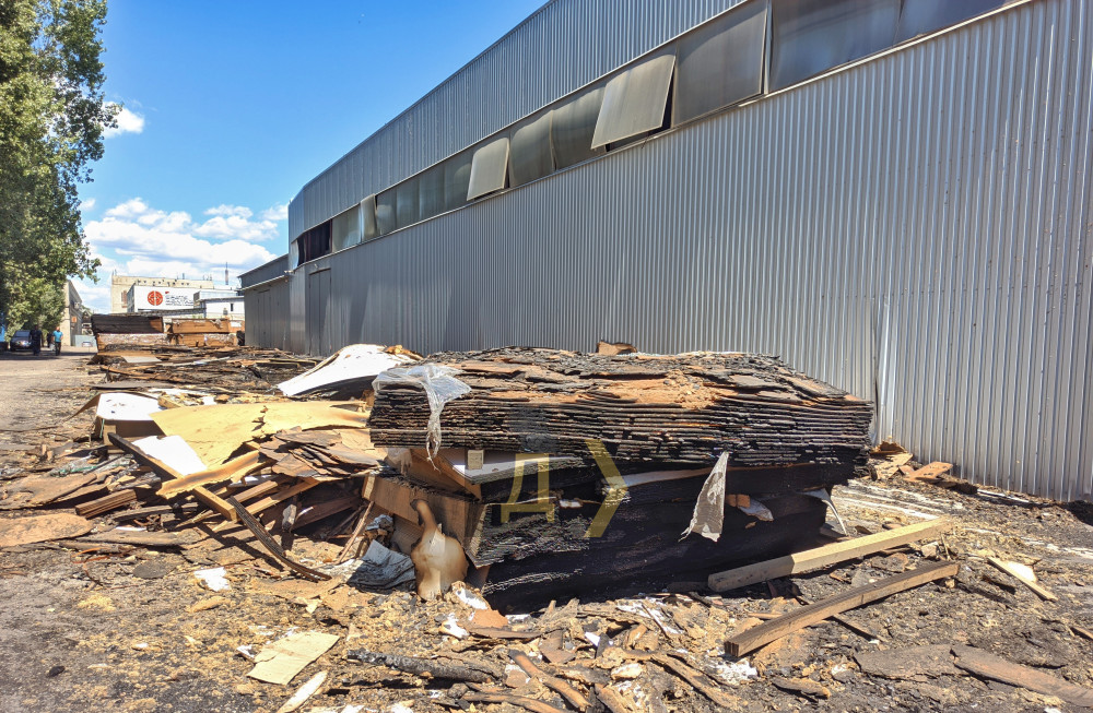 В одному з провулків можна побачити довжелезний рядок зі стопками обгорілих дерев'яних плит. Працівники прибирають складське приміщення від обгорілого майна та конструкцій.