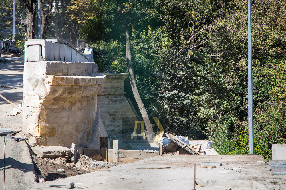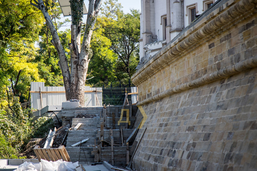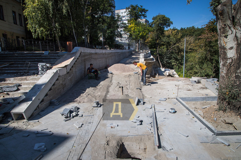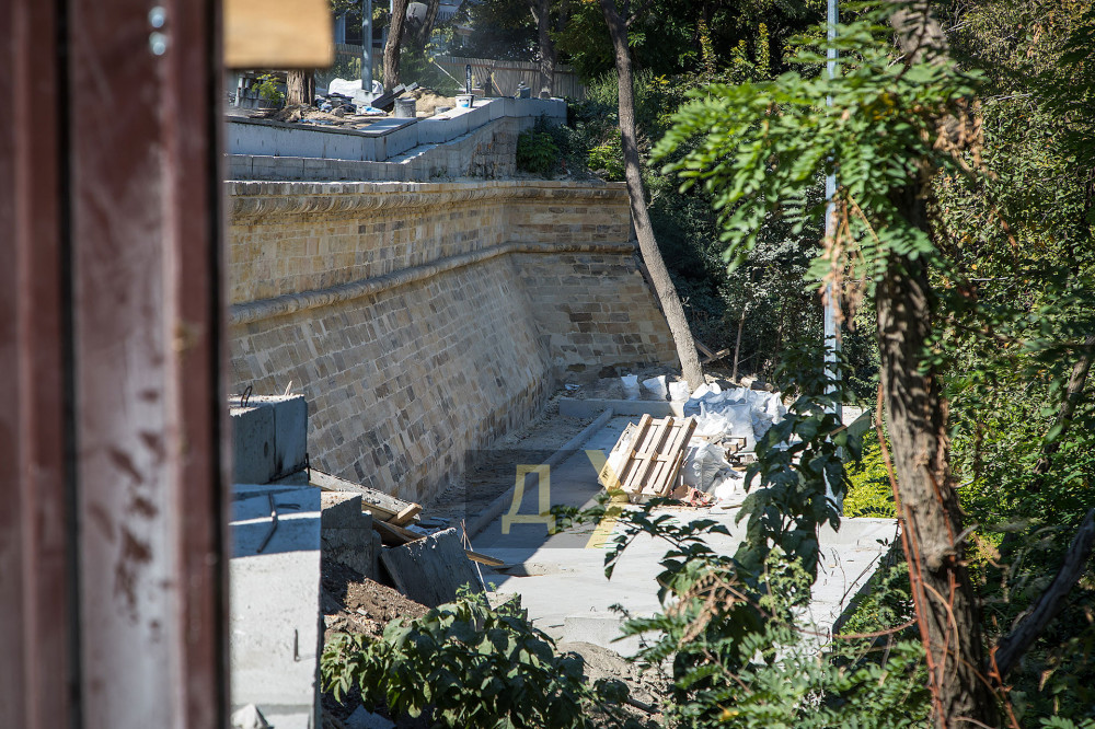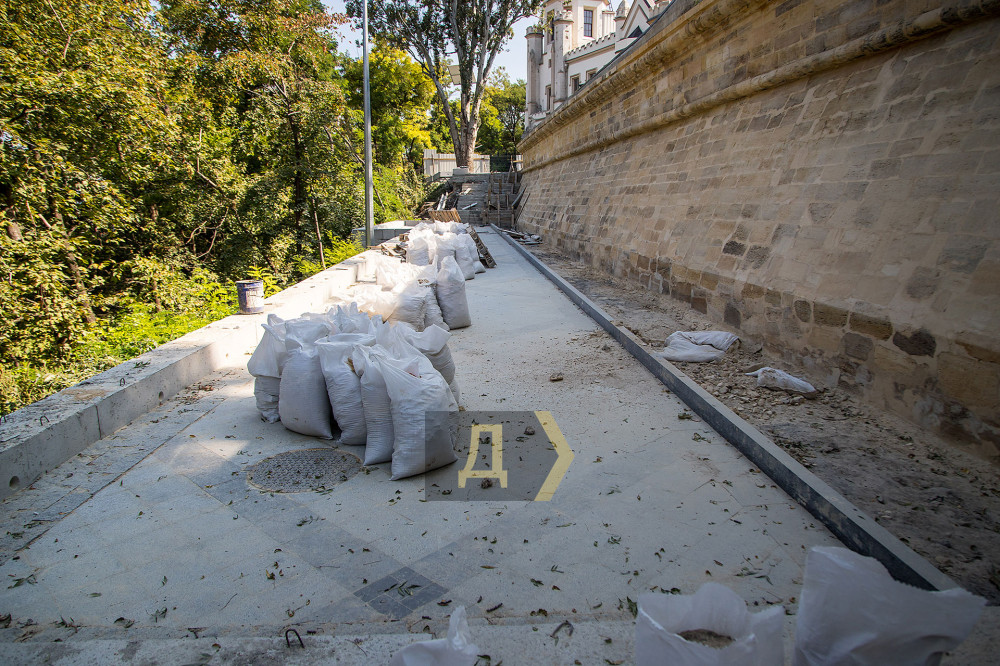 Параллельно небольшой лестнице, расположенной за Шахским дворцом, смонтировали широкий пандус. Ведутся работы и на нижних террасах склона.
