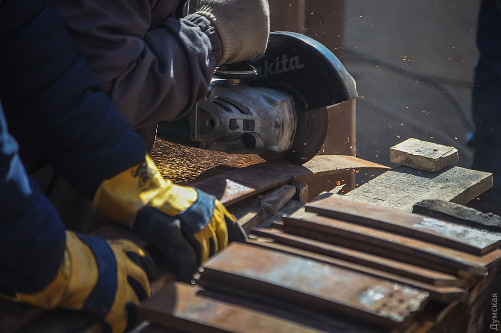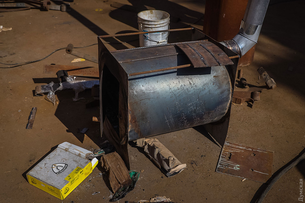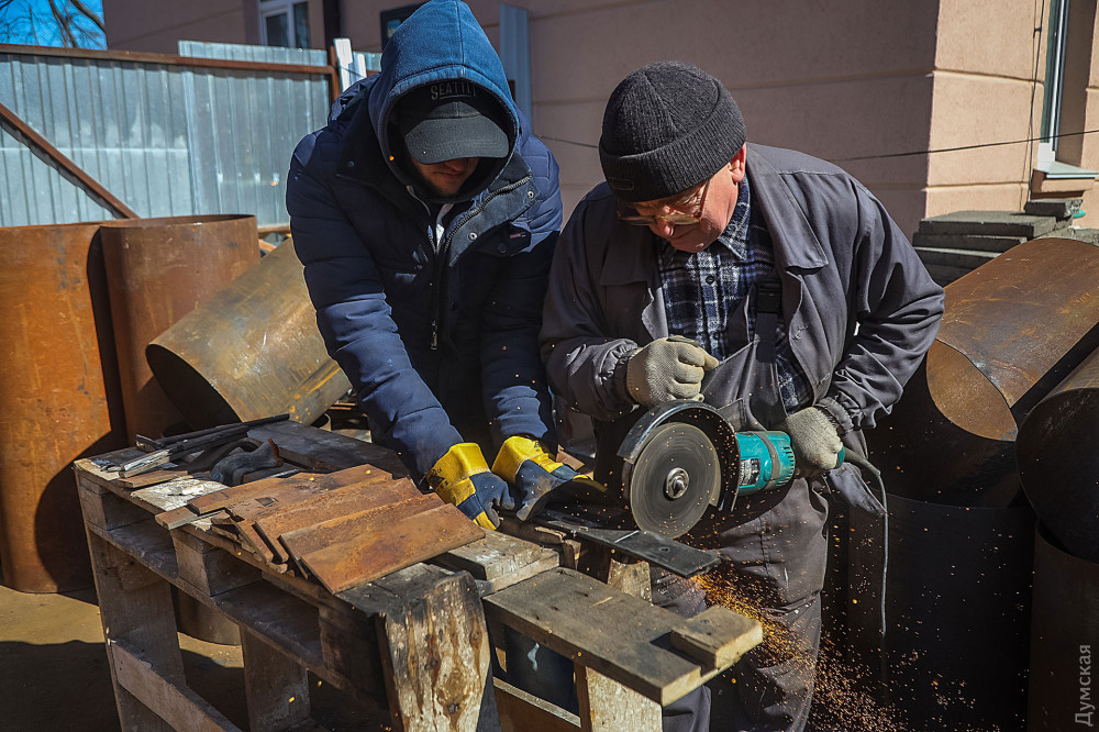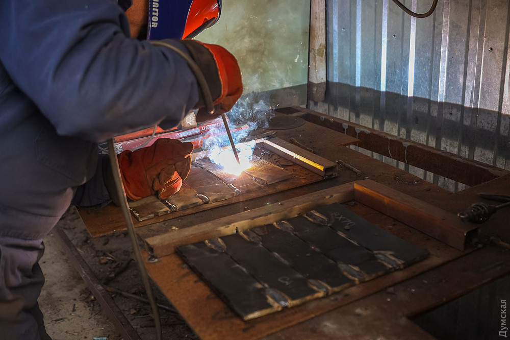 Небольшая, закрытая от посторонних глаз территория на Ближних Мельницах. Работа кипит. Диски турбинок высекают искры из металлических заготовок, сгорающие электроды вспыхивают ослепляющим белым светом, гул, скрежет, звон. Здесь, под открытым небом команда волонтеров собирает изделия, столь необходимые для города, готовящегося к обороне: противотанковые ежи, буржуйки, полевые кухни и, с недавних пор - пластины для бронежилетов.