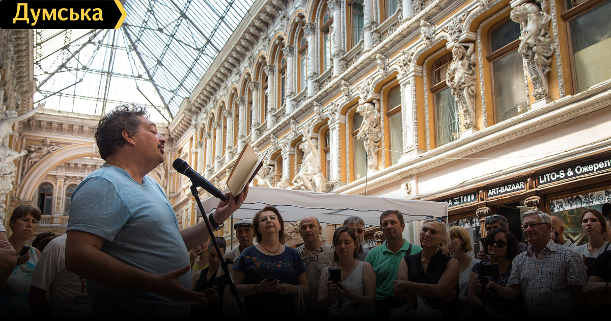 Казалось бы, все, как обычно – утренний «Пассаж», краевед Александр Бабич ведет экскурсию. Но сегодня с ним еще и знаменитый российский писатель Дмитрий Быков, чтобы возвысить свой голос в пользу разрушающегося здания, построенного в 1898-1899 годах, а ныне используемого как скромное общежитие индийских студентов плюс несколько магазинов в галерее. «Особо ценным было то, что здесь располагалась редакция «Одесских новостей», а это значит, что здесь работал Жаботинский, здесь работал Корней Чуковский и третий человек, на котором держалась эта газета – Лазарь Кармен, писатель одесского «дна», — рассказал собравшимся Александр Бабич. – С владельцем «Пассажа», предпринимателем Моисеем Меделевичем, все закончилось печально – в 1915 году он отправил большой корабль с товаром на Америку, этот корабль был потоплен немецкой подводной лодкой. Менделевич выходит просто из дома на улицу, мальчик-газетчик оглашает новости, Менделевич хватается за сердце и как-то очень быстро нас покидает. И еще одну связанную с «Пассажем» историю расскажу, это уже мое: как-то я с одним вором общался, и он рассказал мне, что в девяностые у них на зоне прошла майса, что Менделевич успел спрятать большой клад на чердаке, в куполах. И первые, кто откинулись, стали обыскивать чердаки. Не находят ничегошеньки и решают подрезать того, кто их на эту аферу подбил…». Действие драмы переносится в самые низы «Пассажа», тут важно напомнить, что под зданием галереи устроен подвал с рельсовым путем, сообщающимся с черным двором посредством особых люков, и товары, сбрасываемые в люки, развозились в вагонетках по запасным складам всех находящихся в «Пассаже» магазинов. От кровопролития незадачливого вора спас случай: один из грузчиков перебрал со спиртным и врезался вагонеткой в колонну. «Пьяный грузчик, под нами огромный подвал, — передает Бабич рассказ своего собеседника из девяностых. – Из-под отбитой штукатурки сыплются золотые империалы…. Клад действительно существовал. Мне это рассказывал реальный человек, который никогда бы не соврал в моем присутствии в этой жизни. Сейчас здание болеет; его нынешних хозяев, видимо, это не интересует. Когда его начнут спасать, совсем неясно, городу нашему тоже как-то не до него, сейчас наши городские слуги, я так понимаю, пытаются продать остатки санатория «Молдова». Дмитрий Львович решил помочь нам спасти Одессу, поскольку мы сами, видимо, не справляемся. А то совсем скоро нечего мне будет рассказывать на экскурсиях». «Как вы понимаете, главное все про Одессу, про одесскую писательскую школу, как я ее понимаю, я буду рассказывать сегодня в Зеленом театре, в восемь часов вечера, — сообщил Дмитрий Быков. – И устроители конференции по дороге мне все время говорили, чтобы я здесь много не рассказывал, а то никто не придет в Зеленый театр. Хочу вам сразу сказать, что для меня это выступление бесплатное, чтобы никто не подумал, будто я еду в свободную Украину за длинной гривной из рабской Москалии, а на самом деле, хоть на входе и будут брать 50 гривен, но они символические и поступают в фонд спасения Зеленого театра. Что я могу сказать прежде чем я прочту вам мой любимый кусок из Катаева? Должен все-таки сказать вам, что для меня значит Одесса и одесская литературная школа. Литературных школ в истории России, в истории недолгой русской литературы