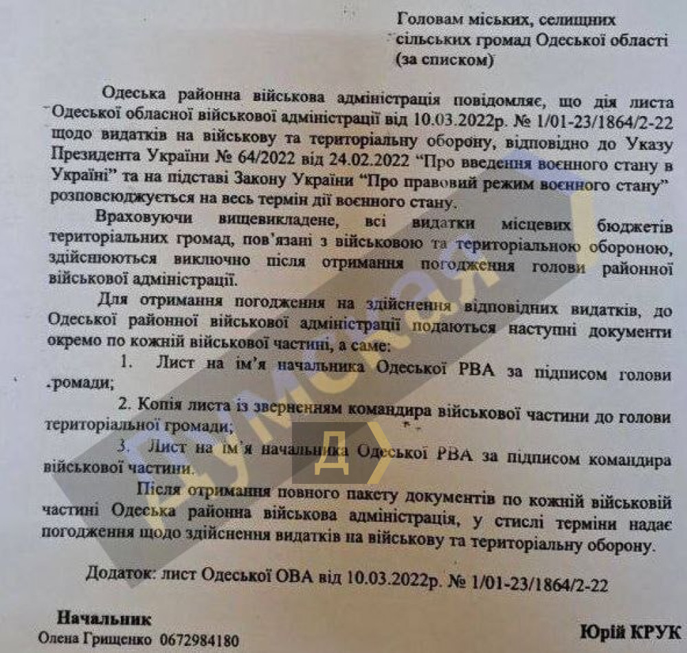 В документі йдеться про те, що всі видатки місцевих бюджетів територіальних громад, пов’язані з військовою та територіальною обороною, мають бути схвалені головою районної військової адміністрації. Так, на думку Юрія Крука, для погодження на здійснення відповідних видатків до його відомства мають надійти наступні документи: лист на ім’я Крука за підписом голови громади, копія листа командира військової частини до голови територіальної громади, лист на ім’я начальника РВА за підписом командира військової частини.