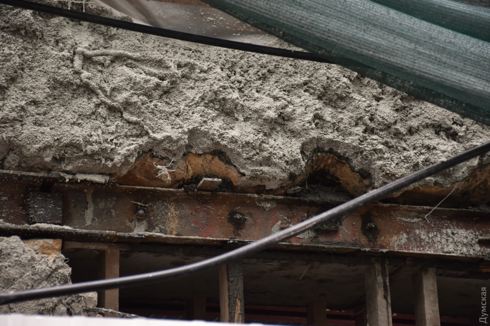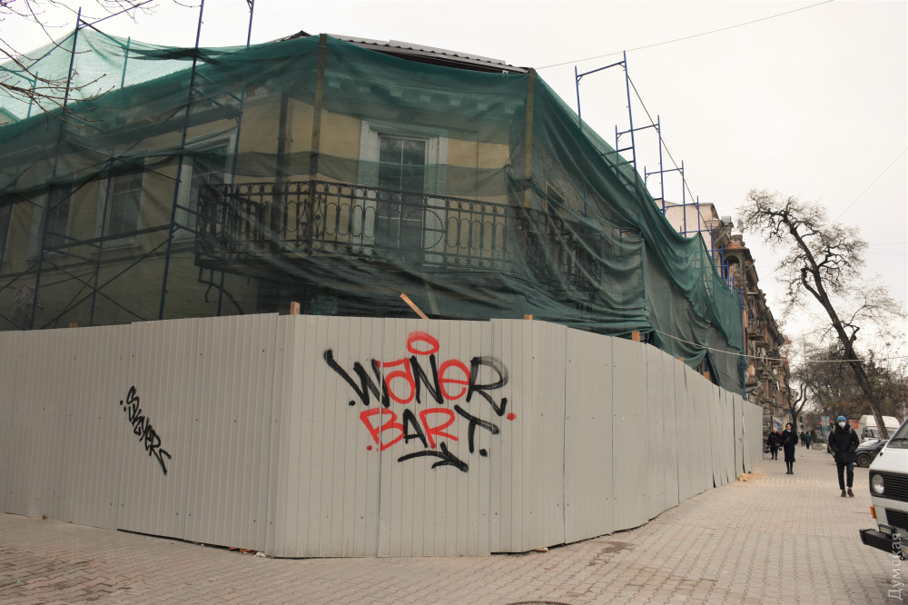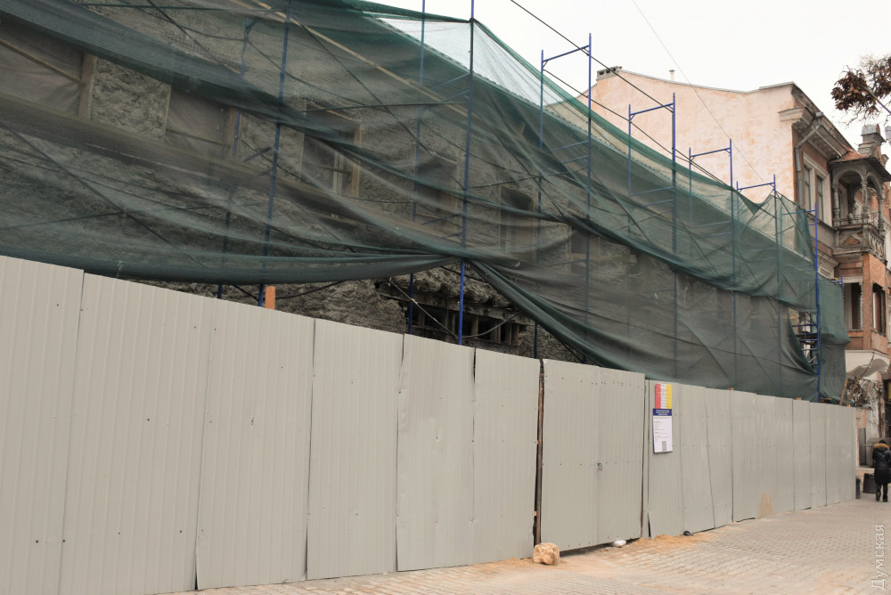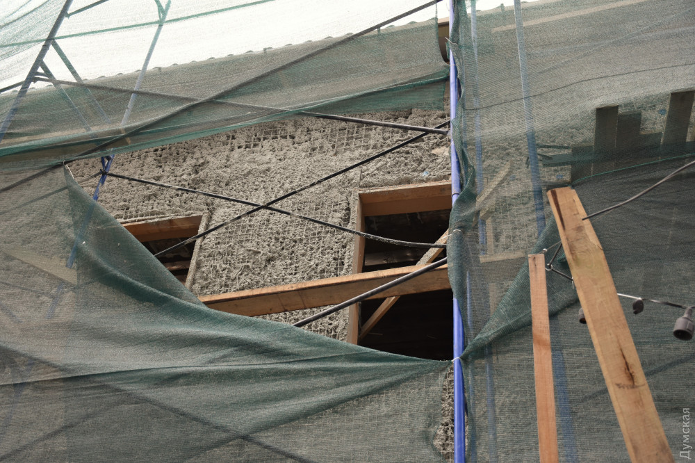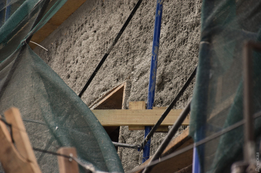 На углу Греческой и Екатерининской продолжаются строительные работы в доме Халпакчи — одном из старейших сохранившихся зданий Одессы, передает корреспондент «Думской».