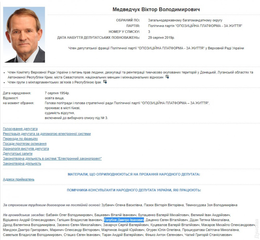 Народный депутат Украины VIII созыва, одессит Дмитрий Голубов стал помощником одного из лидеров пророссийской «Оппоплатформы — За жизнь», действующего нардепа Виктора Медведчука. Соответствующая информация появилась на сайте Верховной Рады Украины, передает корреспондент «Думской».