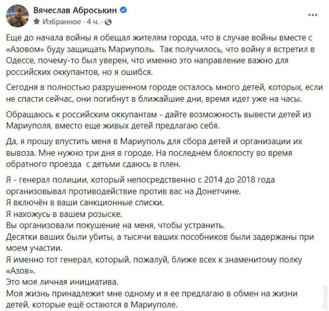 Экс-ректор Одесского полицейского университета предложил обменять себя на детей из осажденного МариуполяЭкс-ректор Одесского государственного университета внутренних дел и бывший первый заместитель начальника Национальной полиции Украины генерал полиции второго ранга Вячеслав Аброськин обратился к оккупантам с предложением обменять себя на детей, оставшихся в блокадном Мариуполе. «Я — генерал полиции, который непосредственно с 2014 до 2018 года организовывал противодействие вам на Донетчине. Я включен в ваши санкционные списки. Я нахожусь в вашем розыске. Вы организовали покушение на меня, чтобы устранить. Десятки ваших были убиты, а тысячи ваших пособников были задержаны при моем участии. Я именно тот генерал, который, пожалуй, ближе всех к знаменитому полку «Азов». Это моя личная инициатива. Моя жизнь принадлежит мне одному, и я ее предлагаю в обмен на жизни детей, которые еще остаются в Мариуполе», — написал он в соцсетях. Генерал добавил, что в городе осталось много детей: «Если их не спасти сейчас, они погибнут в ближайшие дни, время идет уже на часы. Обращаюсь к российским оккупантам — дайте возможность вывести детей из Мариуполя, вместо еще живых детей предлагаю себя!». Вячеслав Аброськин до 2014 года работал в Севастополе, дослужившись до заместителя начальника УМВД. С 2015 по 2017 возглавлял Главное управление Национальной полиции в Донецкой области, а после стал первым заместителем начальника Нацполиции. В октябре 2019 назначен ректором Одесского государственного университета внутренних дел. Награжден орденом «За мужество» III степени. СМЕРТЬ РОСІЙСЬКИМ ОКУПАНТАМ! Помітили помилку? Виділяйте слова з помилкою та натискайте control-enter |