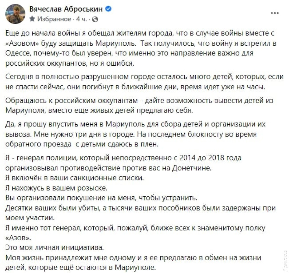 «Я — генерал полиции, который непосредственно с 2014 до 2018 года организовывал противодействие вам на Донетчине. Я включен в ваши санкционные списки. Я нахожусь в вашем розыске. Вы организовали покушение на меня, чтобы устранить. Десятки ваших были убиты, а тысячи ваших пособников были задержаны при моем участии. Я именно тот генерал, который, пожалуй, ближе всех к знаменитому полку «Азов». Это моя личная инициатива. Моя жизнь принадлежит мне одному, и я ее предлагаю в обмен на жизни детей, которые еще остаются в Мариуполе», — написал он в соцсетях.