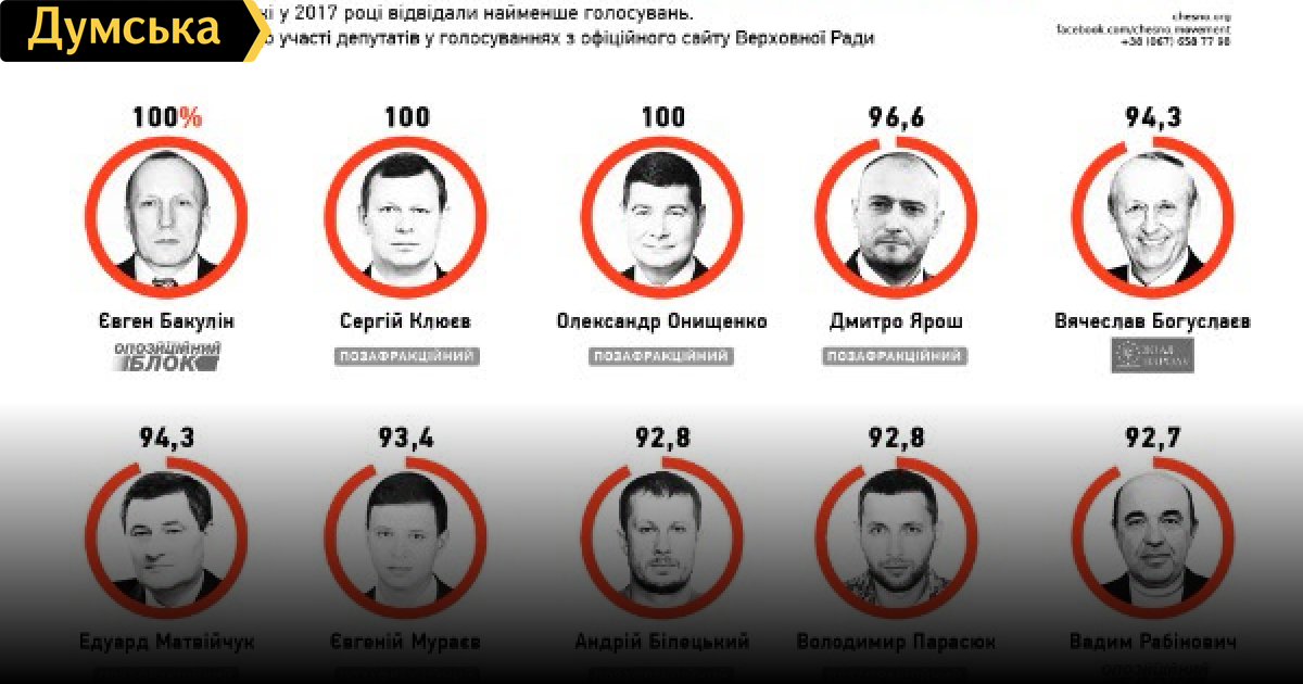 Бывший одесский губернатор Матвийчук вошел в ТОП прогульщиков Рады: в 2017 году он почти не работал в парламентеЭкс-председатель Одесской ОГА и народный депутат Украины Эдуард Матвийчук вошел в список самых заядлых прогульщиков Верховной Рады в уходящем 2017 году. Такие данные приводят участники общественного движения «Честно». Согласно исследованию, Матвийчук пропустил 94,3% парламентских заседаний. 100% заседаний прогуляли нардеп от «ОппоБлока» Евгений Бакулин и внефракционные депутаты Сергей Клюев и Александр Онищенко. Отметим, в 2016 году, согласно отчету КИУ, лидером по прогулам среди одесских нардепов был Иван Фурсин. Составили также ТОП-2017 кнопкодавов Верховной Рады. Среди отличившихся одесский нардеп Василий Гуляев. Лидером же кнопкодавства стал нардеп от депутатской группы «Відродження» Антон Яценко, которого 23 раза уличили в голосовании за коллег. СМЕРТЬ РОСІЙСЬКИМ ОКУПАНТАМ! Помітили помилку? Виділяйте слова з помилкою та натискайте control-enter