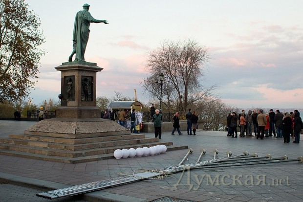 На Екатерининской площади дежурит наряд милиции. Силовики строго следят за тем, чтобы собравшиеся впятером Основатели города (немка-императрица и четыре ее фаворита-евроинтегратора) не переговаривались друг с другом.
