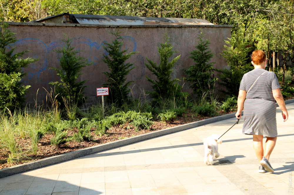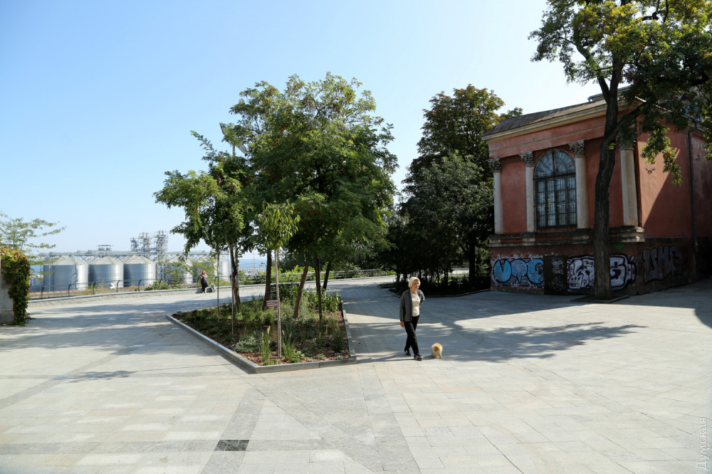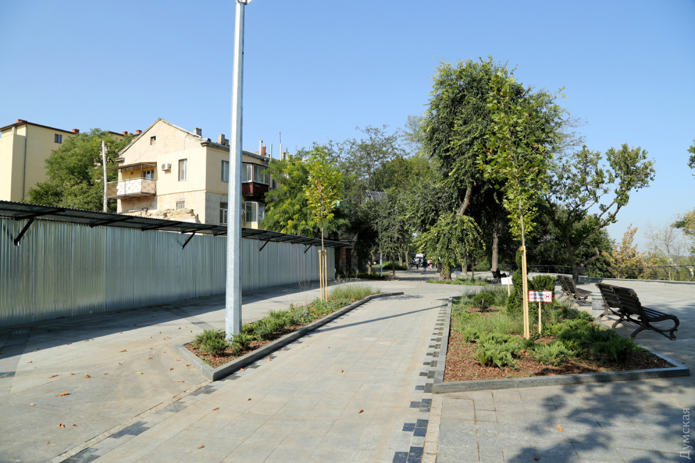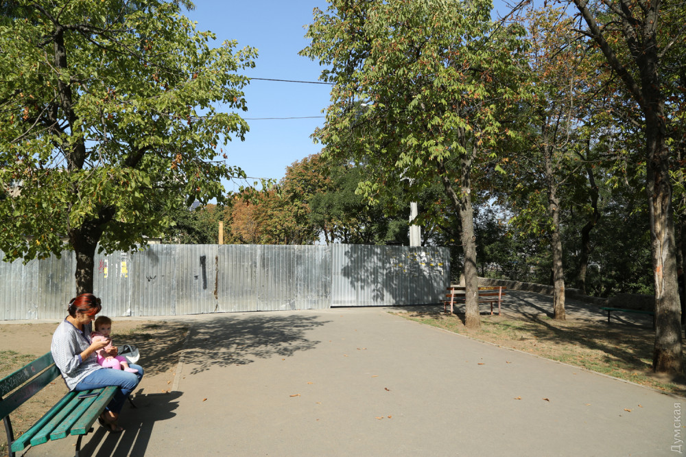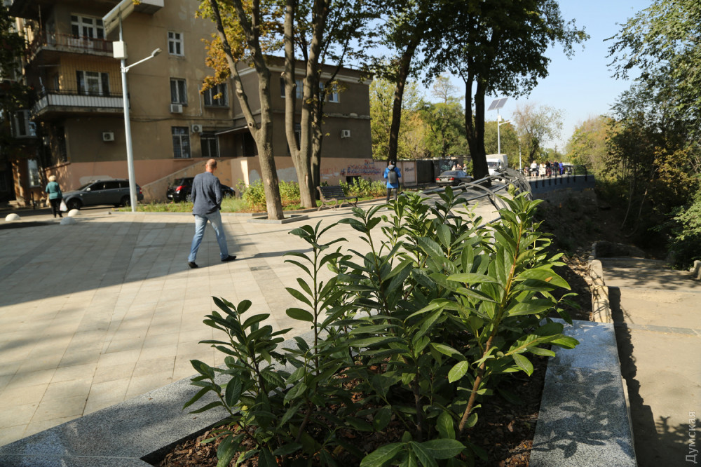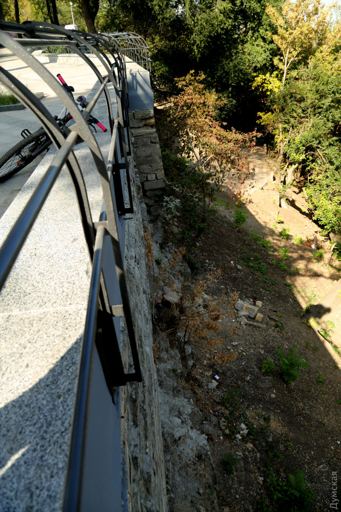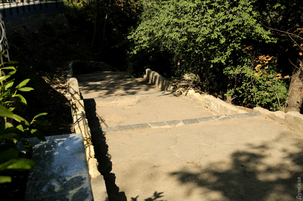 Лестницы, ведущие на склоны, не отремонтированы — там сохранился разбитый асфальт и остатки старинной лавовой плитки. Сами склоны замусорены, а в воздухе стоит устойчивый запах мочи — для одесситов не секрет, что рабочие за забором строек пользуются биотуалетами и душевыми, которые часто выходят из строя.