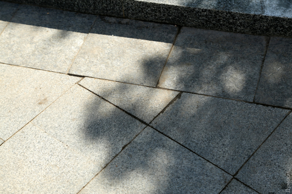 Вызывает вопросы и качество работ. Мы уже писали, что, согласно техзаданию, подрядчик обязался использовать довольно дорогое декоративное покрытие, оформленное под брусчатку (технология Pressbeton). Вместо него появилась более дешевая гранитная плитка, причем явно уложенная на скорую руку — кое-где она шатается, а местами уже разрушена.