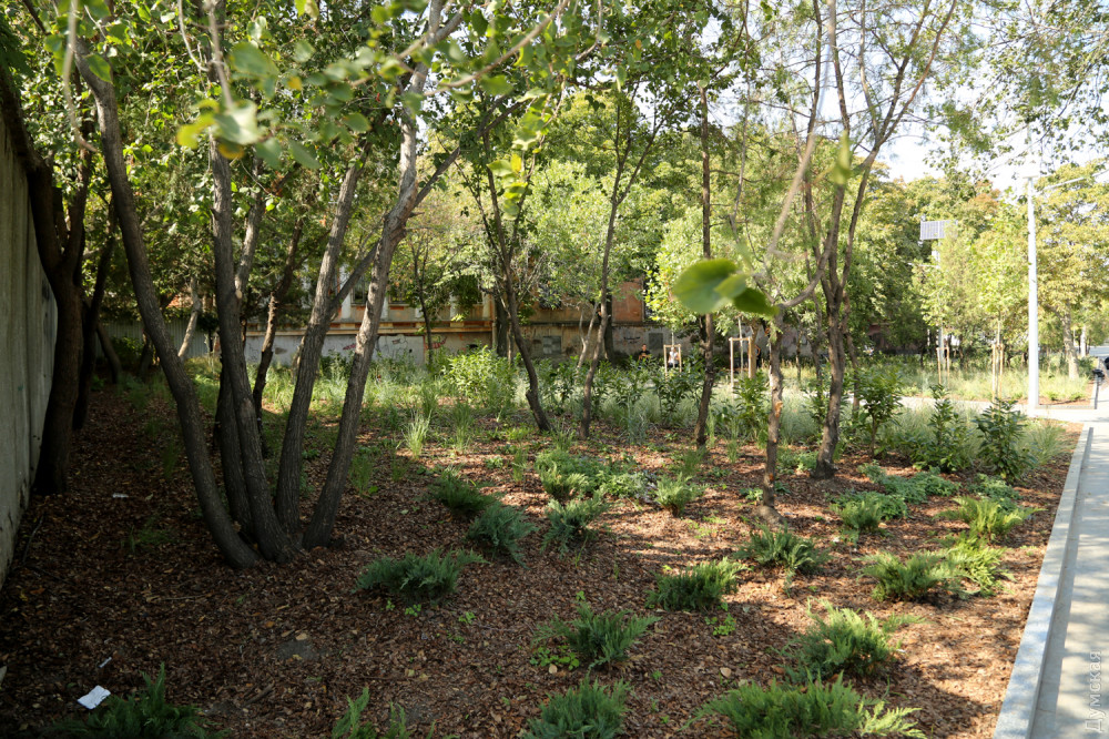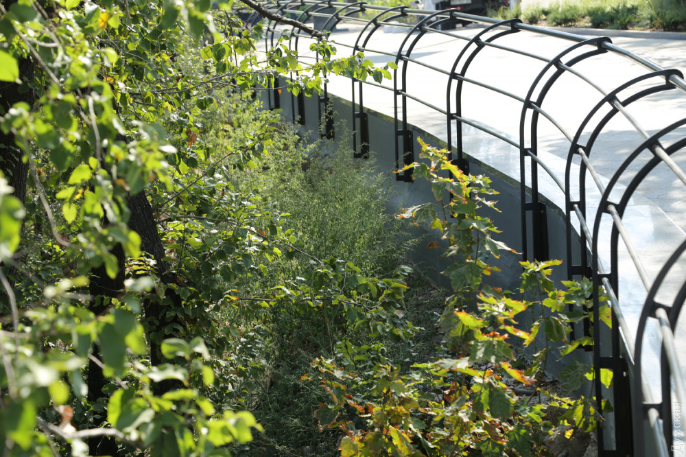 Зеленые участки засыпали модным нынче покрытием — корой хвойных деревьев, смешанной с песком и опилками — и высадили там новые деревья. Везде стоят таблички «Вигул собак — заборонено». На парапетах установили высокую металлическую ограду.