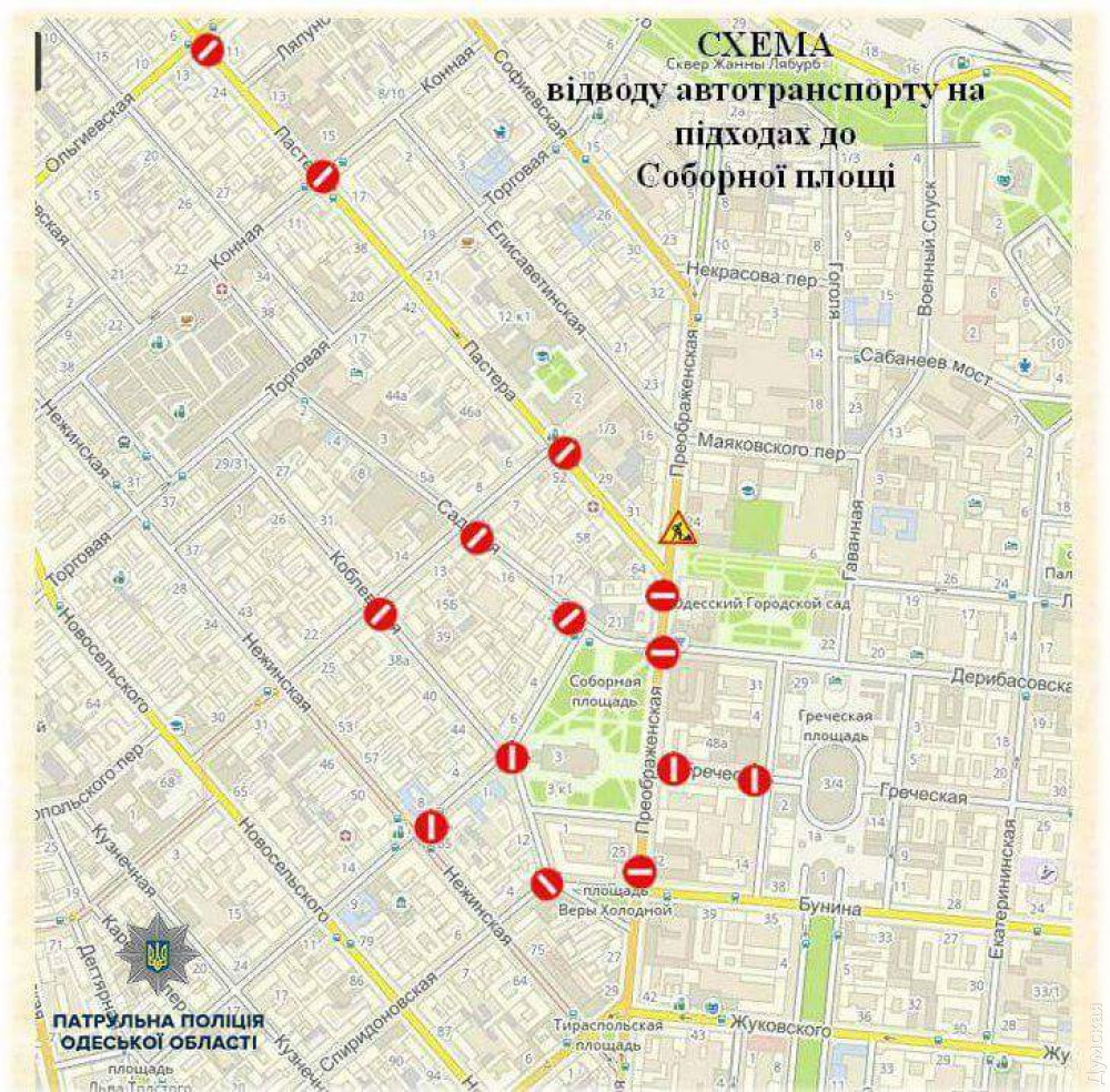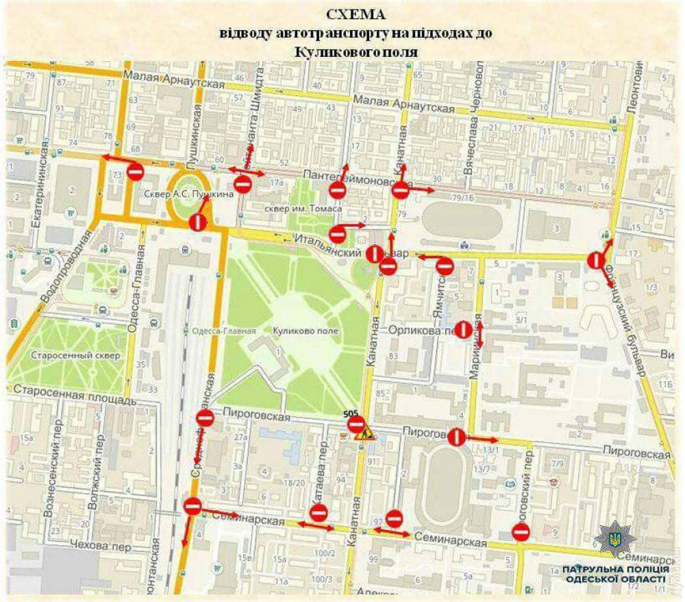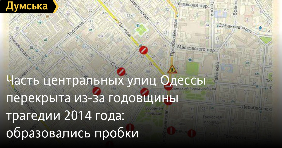 Часть центральных улиц Одессы в районе Соборной площади и Куликова поля перекрыта в связи с массовыми мероприятиями, посвященными четвертой годовщине трагедии 2 мая 2014 года.