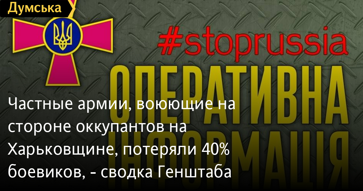 Приватні армії, що воюють на боці окупантів на Харківщині, втратили 40% бойовиків, — зведення ГенштабуПонад 40 % бійців втратили (важкопораненими або вбитими) приватні воєнні компанії, що діють на тимчасово захоплених територіях, зокрема, в населеному пункті Олександрівка Харківської області. Тіла багатьох загиблих не ідентифікуються та рахуються як зниклі безвісти. Нашим воїнам вдалося успішно відбити атаки противника в районах населених пунктів Григорівка, Зайцеве, Соледар, Бахмутське, Бахмут, Весела Долина та Опитне. В результаті 27 авіаударів уражено майже 40 опорних пунктів росіян та скупчення живої сили та техніки. ППО з різних напрямків знищила: літак Су-25, вертоліт Ка-52, дрон та п'ять крилатих ракет Х-101. Ракетні війська та артилерія вдарили по семи пунктах управління та 13 об'єктах зосередження живої сили противника. У зону поразки потрапили радіолокаційні станції зв'язку, мостові та понтонні переправи, три склади боєприпасів та ПММ. СМЕРТЬ РОСІЙСЬКИМ ОКУПАНТАМ! Помітили помилку? Виділяйте слова з помилкою та натискайте control-enter |