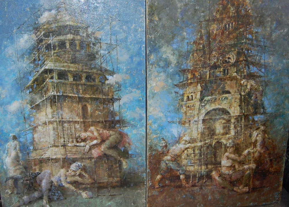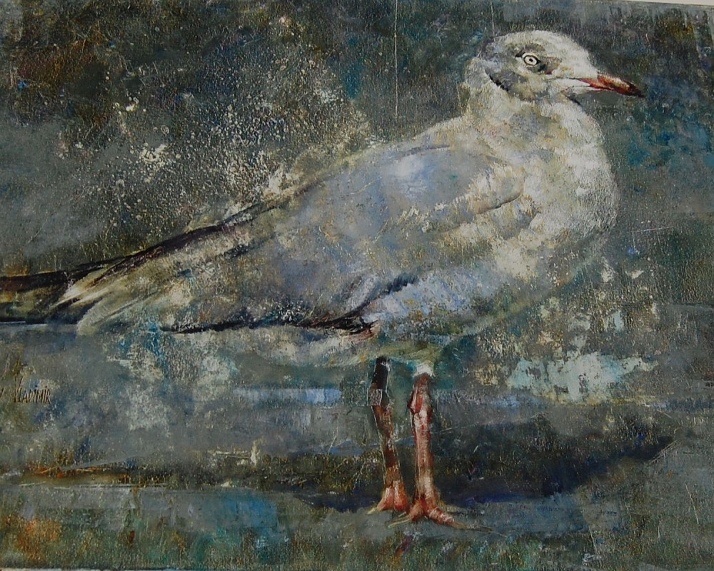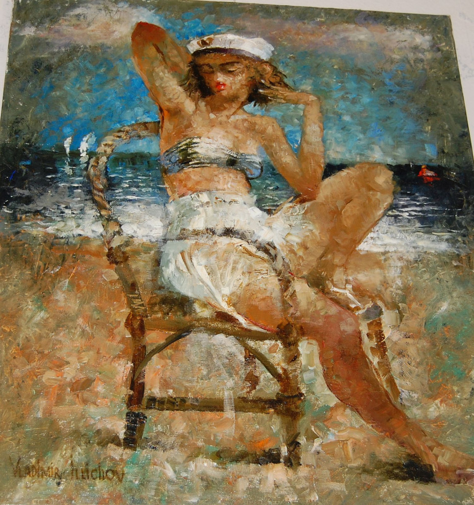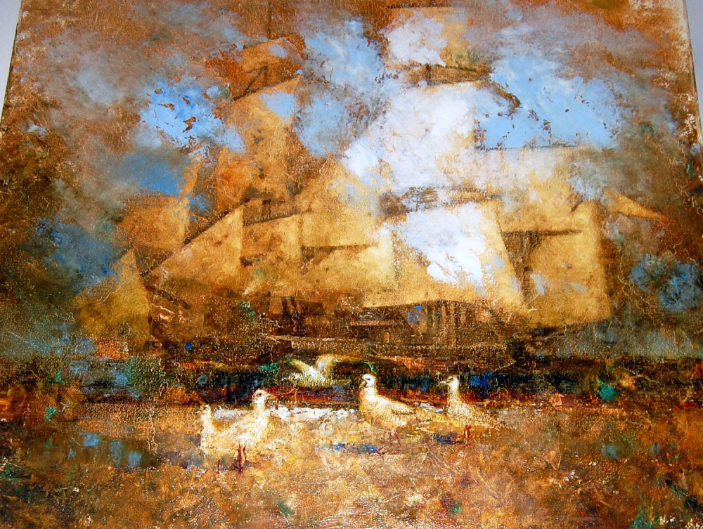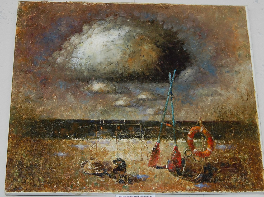 Стоит напомнить, что все работы Ильичевых написаны авторской техникой Blade&Socks, то есть при помощи хлопкового носка, надетого на руку художника. Это дает эффектную размытость, позволяет экспериментировать с контурами облаков (очень реалистично), и всегда присутствует внутреннее свечение. Вальяжные морячки и озабоченные поиском улова чайки да охотничий пес – вот и все персонажи. Их достаточно для охраны морских рубежей, таких спокойных на живописных полотнах…