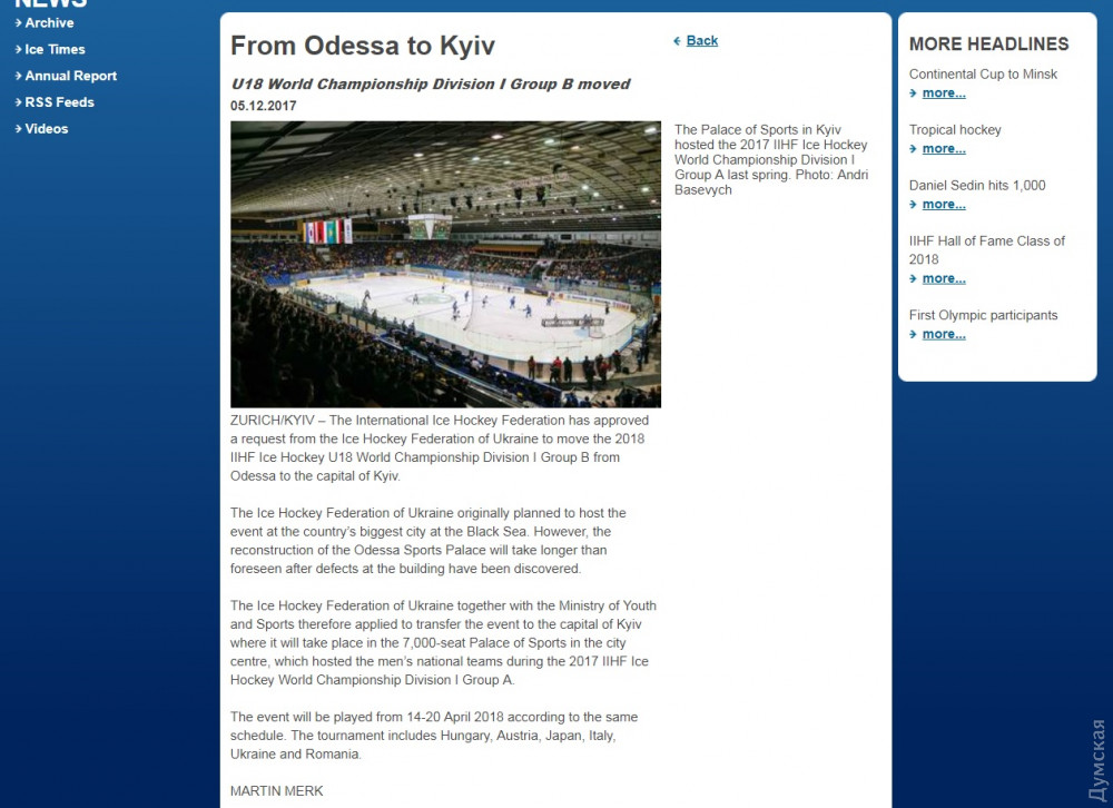 Дело в том, что реконструкция одесского Дворца спорта, где должны были играть команды, затягивается: в здании нашли некие дефекты, устранить которые до весны не успевают. Таким образом, Одесса лишилась возможности первый раз в своей истории принять международные хоккейные соревнования.