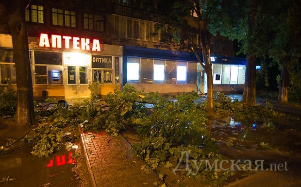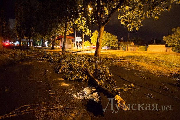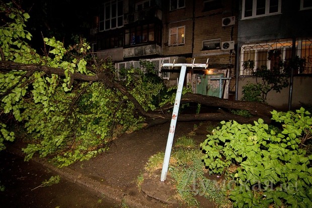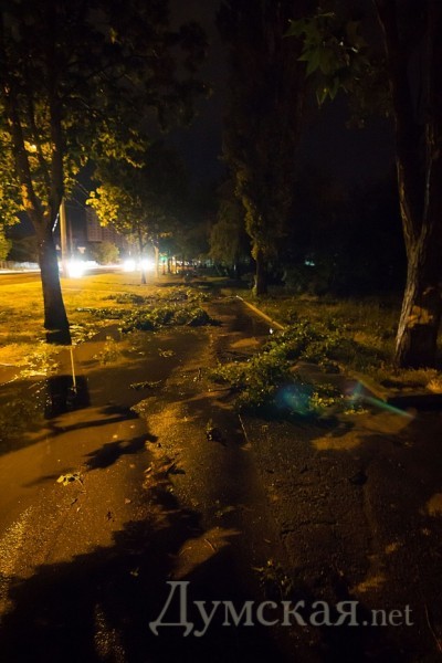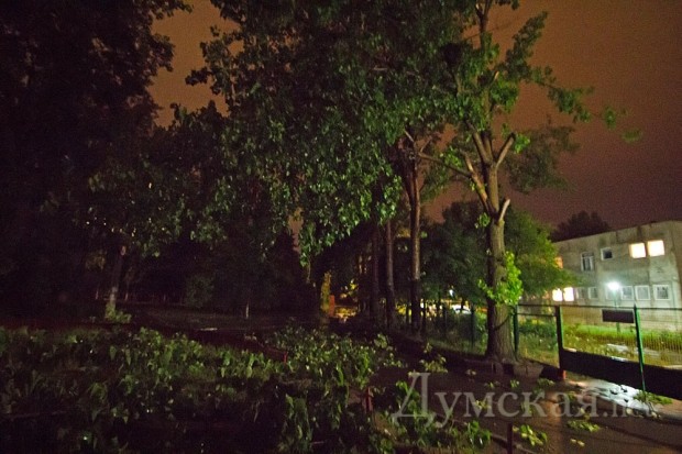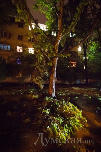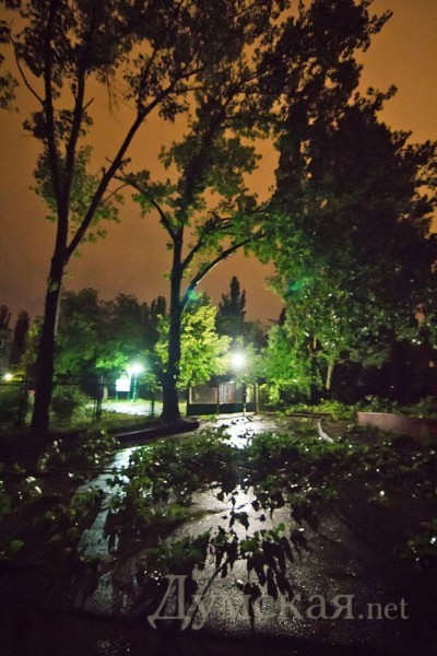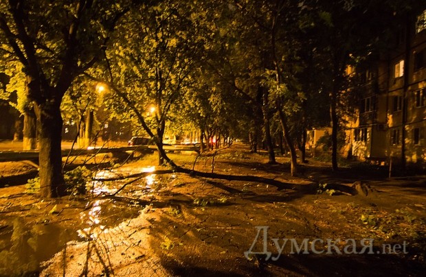 На улице Малиновского одна из парадных дома номер 31 завалена упавшим деревом, передает корреспондент «Думской». Повалено десятки деревьев, в основном — во дворах. Часть деревьев вырваны с корнями, у части отломаны ветки.