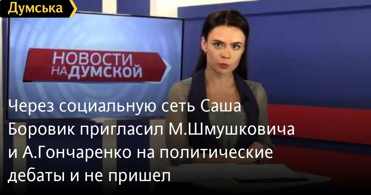 Через социальную сеть Саша Боровик пригласил М.Шмушковича и А.Гончаренко на политические дебаты и не пришелЧерез социальную сеть Фэйсбук Саша Боровик пригласил Михаила Шмушковича и Алексея Гончаренко на политические дебаты на телеканале Думская.ТВ. Когда же с ним связались, чтобы договориться о времени проведения дебатов – уже экс-заместитель губернатора пошел на попятную СМЕРТЬ РОССИЙСКИМ ОККУПАНТАМ! Заметили ошибку? Выделяйте слова с ошибкой и нажимайте control-enter Думская ТВ. Сюжеты: