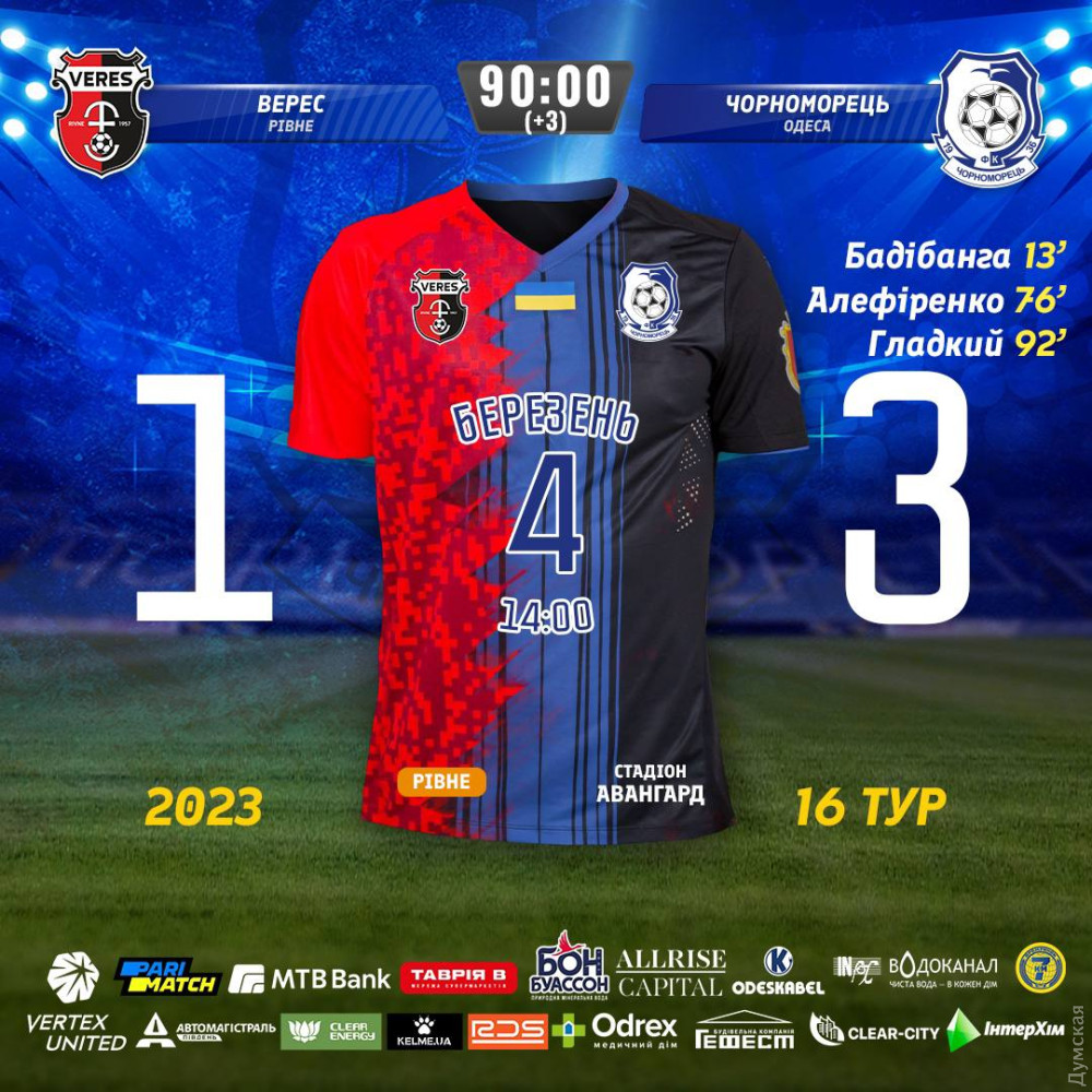 «Чорноморець» з впевненої перемоги в Рівному розпочав друге коло чемпіонату України та залишив зону вильотуФутбольний клуб «Чорноморець» обіграв рівненський «Верес» на його ж полі. Як передає кореспондент «Думської», підопічні Романа Григорчука взяли переконливий реванш у Вереса за поразку у першому турі. Одесити повели в рахунку на 13-й хвилині. Команда якісно вийшла з оборони в атаку — Лука Гучек віддав вертикальний пас на Зігі Бадібангу, той спочатку майстерно розправився з захисником господарів, а потім і з Богданом Когутом. До кінця першого тайму перевагою володіла команда Юрія Вірта. Рівняни подовгу володіли м'ячем, але оборона чорно-синіх гідно трималася. По перерві вже одесити більше часу проводили в атаці. Успіх «Вересу» принесла чи не перша атака в другому таймі. Господарі заробили штрафний, і після першого удару Дмитро Непогодов команду врятував. Проте на добиванні був Маткобожик — 1:1. Хвилин 10 ситуація на полі була доволі напруженою — ніхто не хотів програвати, ціна помилки була дуже високою. Напругу зняв Даниїл Алефіренко, якого Роман Григорчук випустив на заміну. Наш вінгер першим зорієнтувався під час подачі кутового біля воріт Когута і заблокованого удару Гучека. За 15 хвилин до кінця гри «Чорноморець» знову вийшов вперед і перемогу вже не впустив! Знак оклику поставив Олександр Гладкий, впевненим ударом з пенальті, який він сам і заробив. 3:1 — важлива, своєчасна перемога команди Романа Григорчука, яка принесла чорно-синім 14 очок і підняла на дванадцяту сходинку. За тиждень «Чорноморець» вдома зіграє проти ФК «Металіст 1925». СМЕРТЬ РОСІЙСЬКИМ ОКУПАНТАМ! Помітили помилку? Виділяйте слова з помилкою та натискайте control-enter |