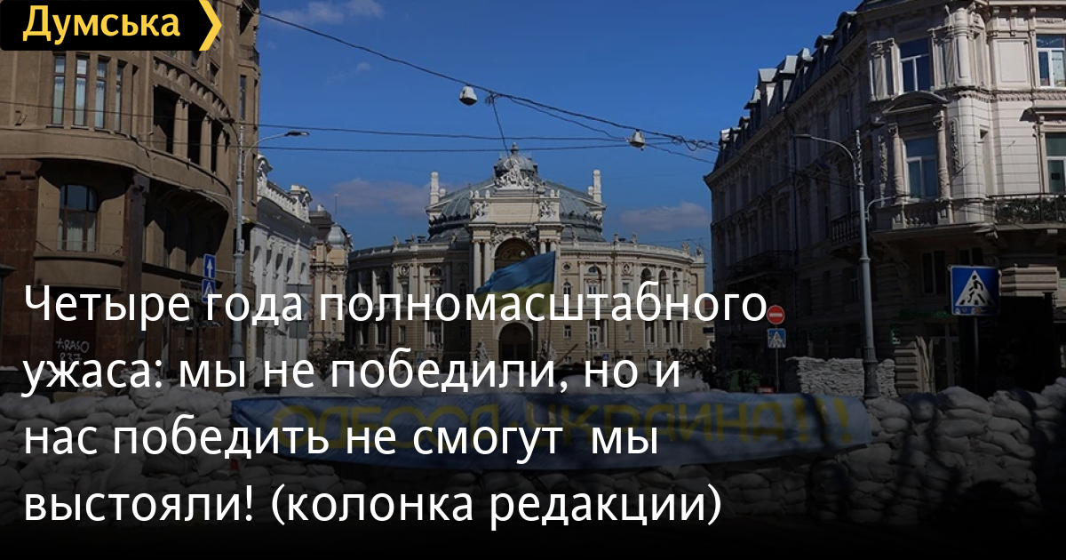Четыре года полномасштабного ужаса: мы не победили, но и нас победить не смогут — мы выстояли! (колонка редакции)Снова 24 февраля Четыре года полномасштабки, 12 лет всей войны. До и после, жизнь напополам. Дороги, заполненные сожженными машинами. Детские тельца. Вой матерей. Буча, Мариуполь Ушедшие на небо побратимы. Рев сирен и жужжание шахедов. Грязь окопов. Рои дронов и мух над трупами. Вонь госпиталя, кровавые пятна на бинтах. Бурун у форштевня и дымный след на воде. Жесткость блиндажного настила. Ноги съедает проклятый грибок, а флиска нифига не греет. Циничные заявления политиков отравляют души, как и привычная ложь пропаганды. Усталость. Боль. Мы не были рождены для войны, но мы стали ее частью. Мы — это все, каждый украинец. Мы дополнили собой систему «свой-чужой», заточенную на выживание и убийство. Второе — обязательное условие, чтобы было первое. Мы умираем в килзон, в самолетах и коробках кораблей, мы тянем свои семьи в тылу, в укромных местечках собираем все новые и новые ФПВ-шки. Конфликтуем друг с другом, злимся, бузим, страдаем. Но… Мы выжили. Больше десяти лет огромная империя бьется о нашу скромную коррумпированную республику и ничего сделать с ней, с нами, не может. Весь прошлый год они пытались организовать наступление хотя бы оперативного масштаба, но не случилось. И опять их усилия свелись к штурмам отдельных сел и поселков. Успехи сугубо тактические, ни на что не влияющие, ни к чему не ведущие, кроме колоссальных потерь. За это время Силы обороны, испытывающие свои проблемы, в частности кадровые, умудрились выстроить новые линии, обрели дополнительный ресурс в виде кучи беспилотных подразделений и — не скажем, что с легкостью, — но в целом купируют все поползновения врага. Мы, которым прочили скорое поражение, не имея никаких шансов, свели игру в ничью. Которая больше похожа на победу, поскольку ничья устраивает нас, а вот для Москвы она равносильна поражению. Ну не может сверхдержава сточиться о бывшую колонию почти в ноль. А ежели такое случается, то, вероятно, вождь неправильный. Акела промахнулся… Война продолжается. Будут новые и новые гробы с телами защитников, будут новые разбомбленные в ноль города, блэкауты, трагедии и прочее. Ужас и боль никуда не денутся. И тем не менее, как нам кажется, переломный момент уже наступил. Украина выстояла, уничтожить ее русские более не смогут. Государство, нация состоялись, прошли экзамен на выживание! Теперь бы как-то выйти из этого морока. Верим в Силы обороны, в наши Вооруженные силы. Они справятся. Слава Украине! Автор — редакция «Думской» СМЕРТЬ РОССИЙСКИМ ОККУПАНТАМ! Заметили ошибку? Выделяйте слова с ошибкой и нажимайте control-enter |