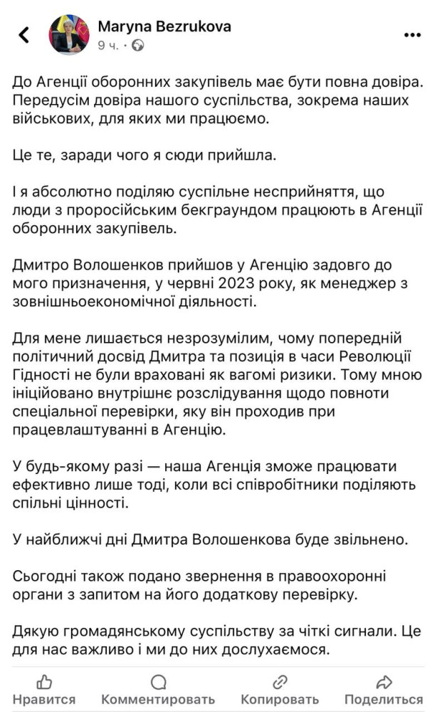 «Дмитро Волошенков прийшов в агентство задовго до мого призначення, в червні 2023 року, як менеджер із зовнішньоекономічної діяльності, — розповіла вона. — Для мене залишається незрозумілим, чому попередній політичний досвід Дмитра та позиція за часів Революції Гідності не були враховані як вагомі ризики. Тому мною ініційовано внутрішнє розслідування щодо повноти спеціальної перевірки, яку він проходив при працевлаштуванні в агентство. У будь-якому разі — наше агентство зможе працювати ефективно тільки тоді, коли всі співробітники поділяють спільні цінності.
