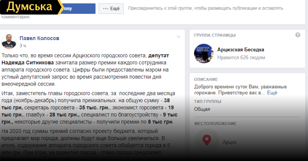 В Одесской области мэрия райцентра выделила себе почти столько же, сколько на развитие городаСотрудники аппарата Арцизского горсовета Одесской области в ноябре-декабре 2019 года получили премии в размере от 8 до 38 тысяч гривен. Об этом стало известно на сегодняшней сессии собрания, рассказал местный активист Павел Колосов. Так, вице-мэр Татьяна Макарова за ноябрь-декабрь получила премиальных на общую сумму 38 тысяч гривен, секретарь горсовета Диана Барсукова — 35 тысяч гривен. Экономисту горсовета выплатили 19 тысяч гривен, главбуху — 28 тысяч гривен, специалисту по благоустройству — 9 тысяч гривен, некоторым другим специалистам — по 8 тысяч гривен. За два месяца общая зарплата мэра города Владимира Михова составила всего 33 тысячи гривен, при этом его зам Макарова получила 68 тысяч гривен, секретарь горсовета — 67 тысяч гривен, главбух — 54 тысячи гривен. Интересно, что в бюджете Арциза на 2020 год на содержание аппарата мэрии выделено 5 млн грн. Весь бюджет развития города — 6 млн. СМЕРТЬ РОСІЙСЬКИМ ОКУПАНТАМ! Помітили помилку? Виділяйте слова з помилкою та натискайте control-enter