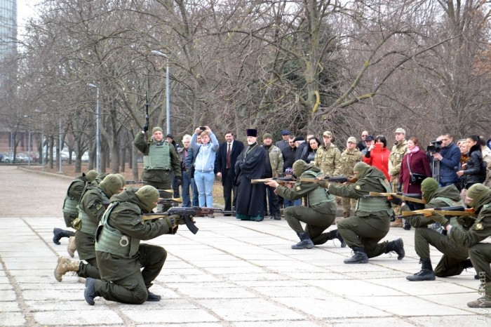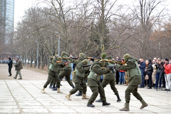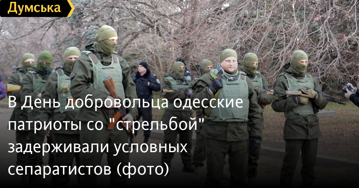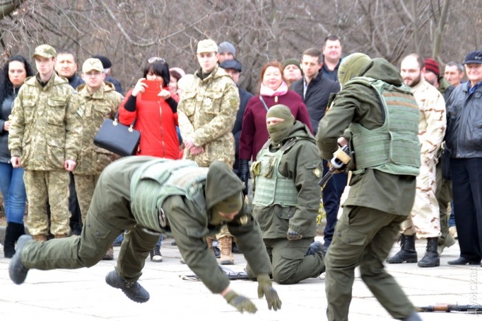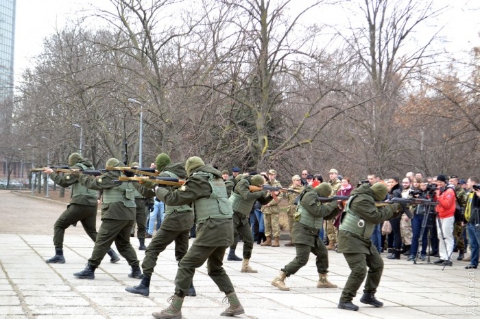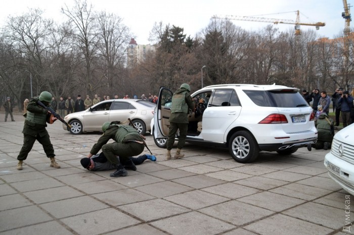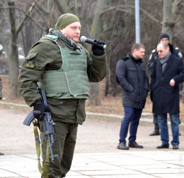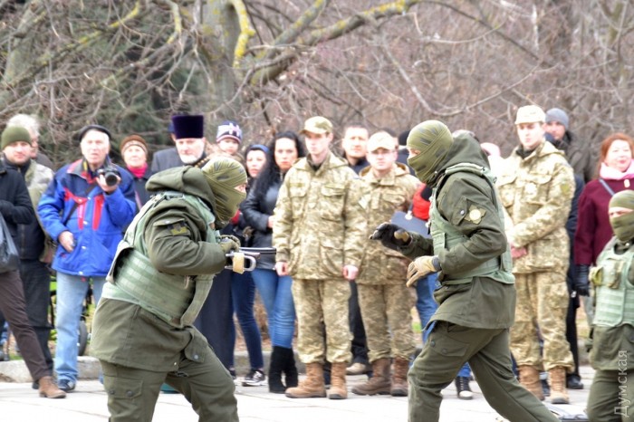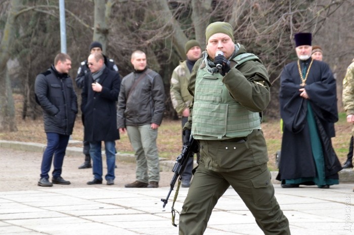 После возложения цветов, которое сопровождалось оружейным залпом, представители «Самообороны Одессы» провели показательное выступление по задержанию «сепаратистов». Интересно, что во время отработки самообороновец Тодор Пановский вместо команд палил в воздух одиночным из автомата — это служило сигналом для выполнения нового упражнения.