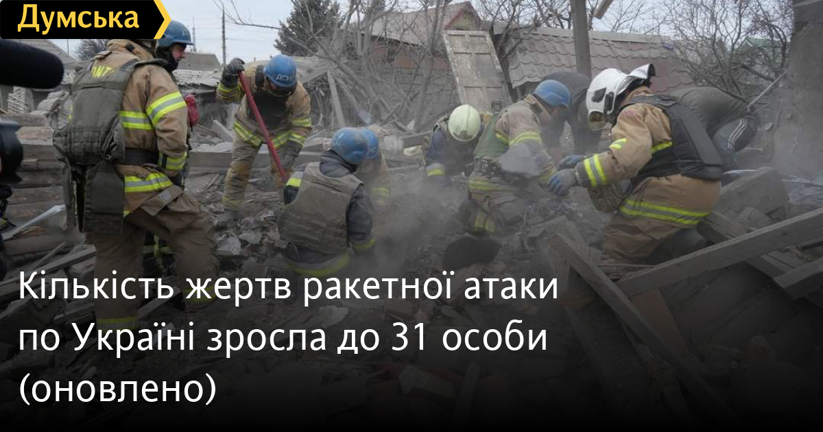 Кількість жертв ракетної атаки по Україні зросла до 31 особи (оновлено)Уже 26 людина загинули внаслідок ранкової ракетної атаки російських окупантів по українських містах 29 грудня — розбір завалів триває. Понад 120 осіб отримали поранення, повідомив заступник голови Офісу президента України Олексій Кулеба. Він закликав жителів усіх регіонів країни не ігнорувати повітряні тривоги. За даними ДСНС та обласних військових адміністрацій, у Києві загинуло шестеро людей і постраждало понад 20. У Запоріжжі — шість загиблих і понад 10 поранених. У Дніпрі — шість загиблих і 28 постраждалих. У Харкові — троє загиблих і понад 10 постраждалих. У Львові — один загиблий і понад 15 постраждалих. Як раніше повідомлялося, в Одесі кількість загиблих зросла до чотирьох, постраждали 22 людини, зокрема двоє дітей. Нагадаємо, під час ранкової атаки окупанти випустили по українських містах близько 110 ракет. ОНОВЛЕНО О 19:20. У Києві знайдено тіла ще трьох осіб, у Запоріжжі — ще двох. Загальна кількість загиблих склала 31. СМЕРТЬ РОСІЙСЬКИМ ОКУПАНТАМ! Помітили помилку? Виділяйте слова з помилкою та натискайте control-enter |