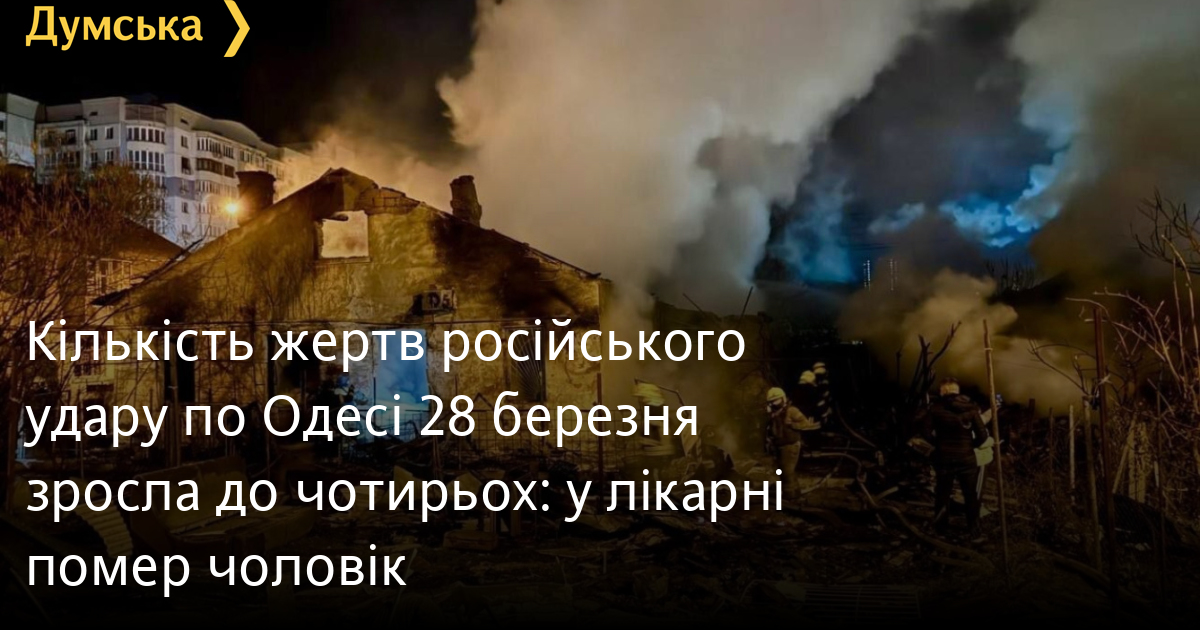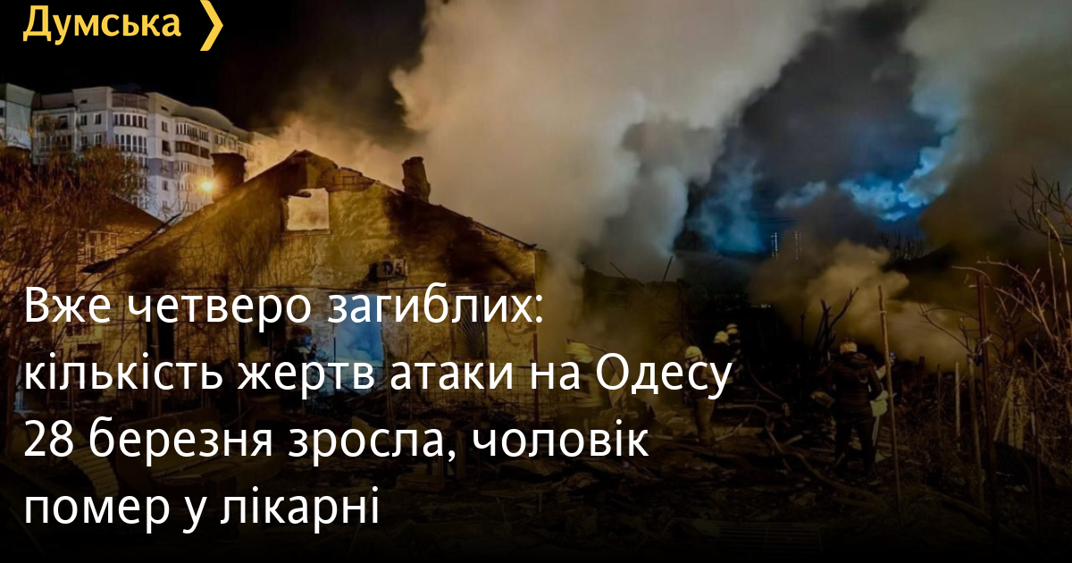 Вже четверо загиблих: кількість жертв атаки на Одесу 28 березня зросла, чоловік помер у лікарні79-річний чоловік, який отримав поранення під час атаки РФ на Одесу 28 березня, помер у лікарні. Він проходив лікування, але його організм не впорався з травмами, повідомили в мерії. Таким чином, кількість загиблих у результаті цієї атаки зросла до чотирьох. Ще 14 осіб постраждали, у тому числі 9-річний хлопчик, чия мама загинула в результаті удару. Нагадаємо, під час масованої атаки ворог випустив по Одесі понад 60 безпілотників. В результаті серйозно постраждав пологовий будинок 5, а також два дитячі садки та вищий навчальний заклад. Крім того, пошкоджено дві п'ятиповерхівки, 10 багатоквартирних і 12 приватних будинків, а також 10 автомобілів. СМЕРТЬ РОСІЙСЬКИМ ОКУПАНТАМ! Помітили помилку? Виділяйте слова з помилкою та натискайте control-enter |