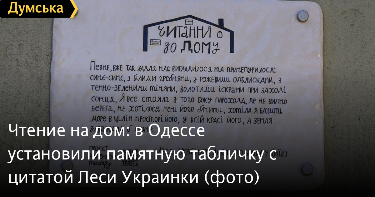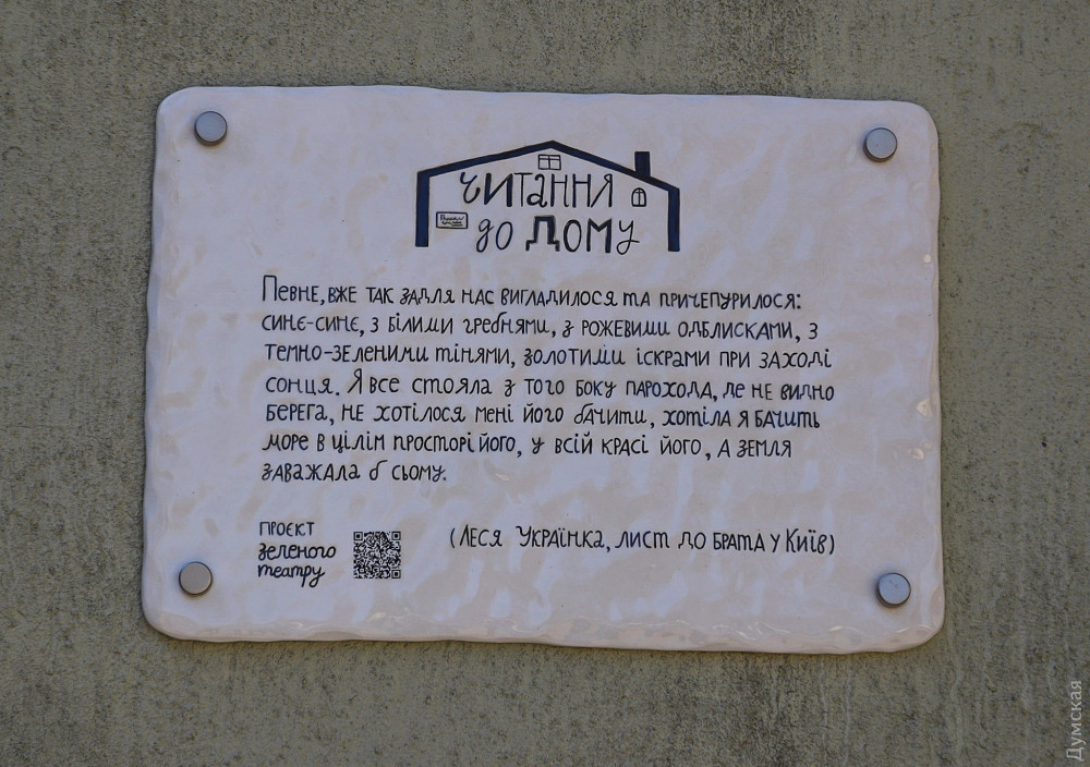 Памятную табличку с цитатой великой украинской поэтессы и писательницы Леси Украинки установили в Одессе в рамках проекта «Чтение на дом», который реализует Зеленый театр совместно с турагентством «Тудой-Сюдой».