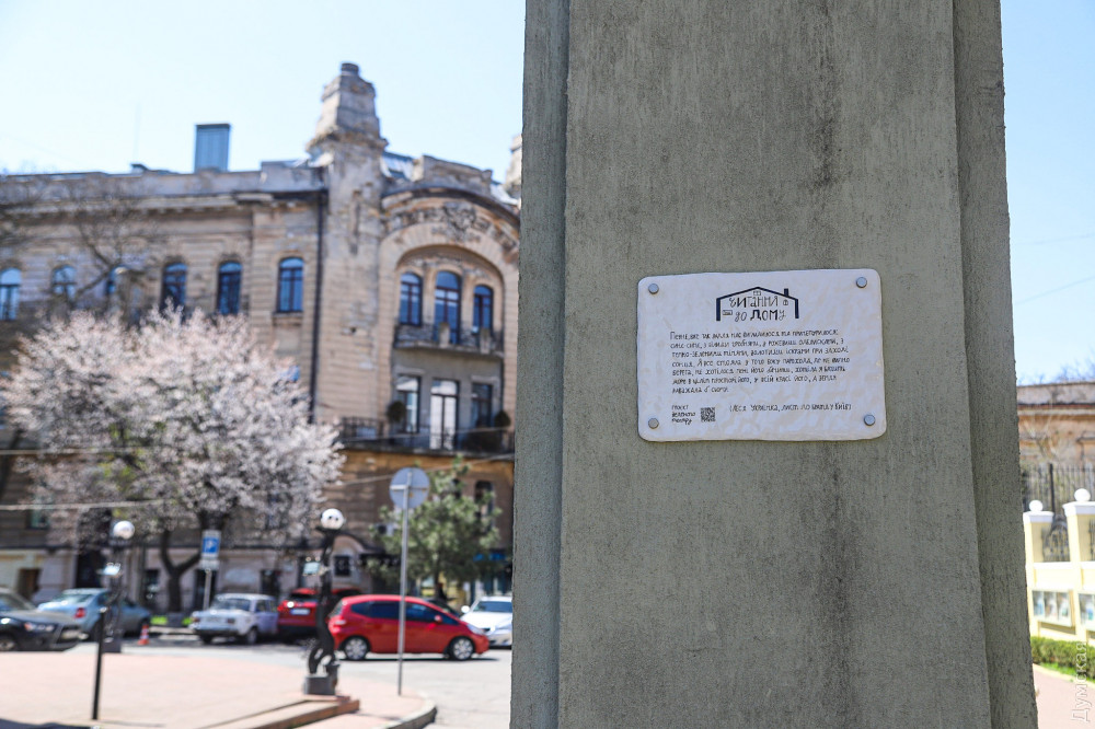 Ранее такие таблички появились на Строгановском мосту (с отрывком из книги Юрия Олеши «Стадион в Одессе»), на территории Зеленого театра (с цитатами Владимира Жаботинского и Михаила Жванецкого), на Софиевской, 17 (с отрывком из «Одесских рассказов Исаака Бабеля) и на стене дома №133 по Старопортофранковской (еще один текст Жванецкого).