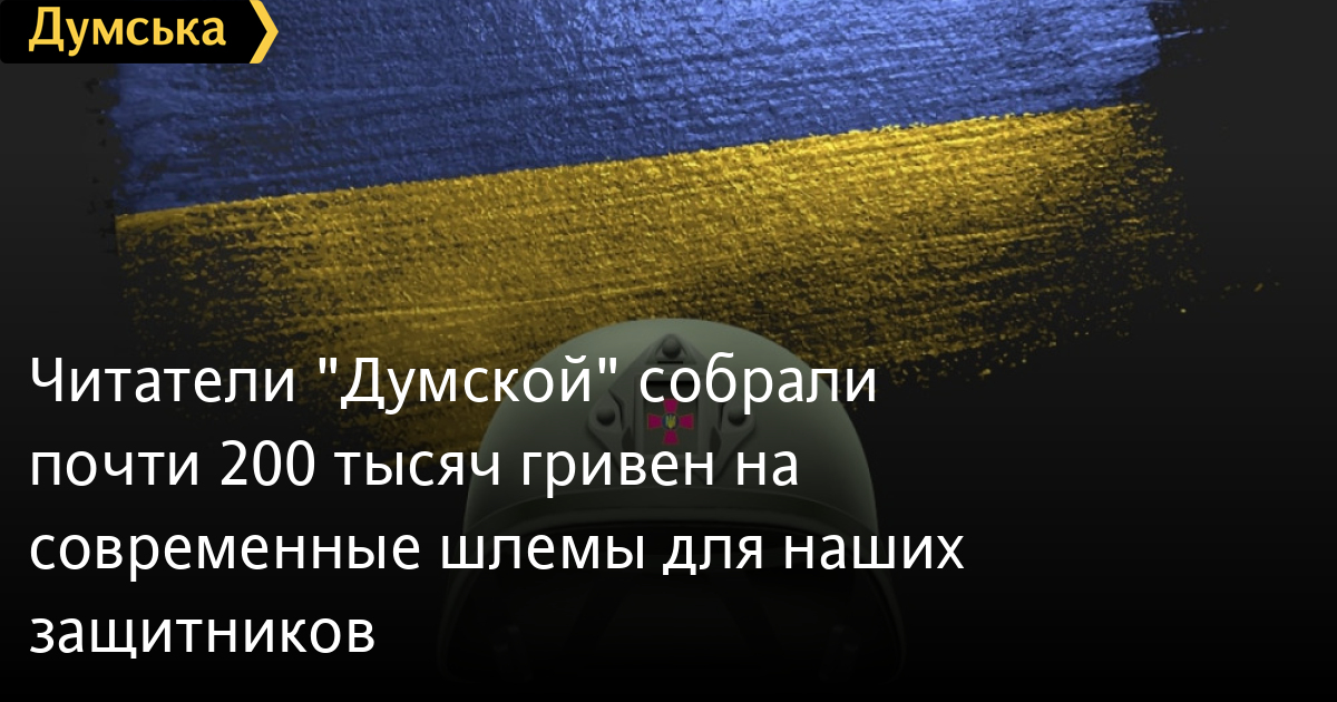 198 тысяч гривен на шлемы для Вооруженных сил Украины собрали читатели «Думской» со всего мира. Сбор закрыт!