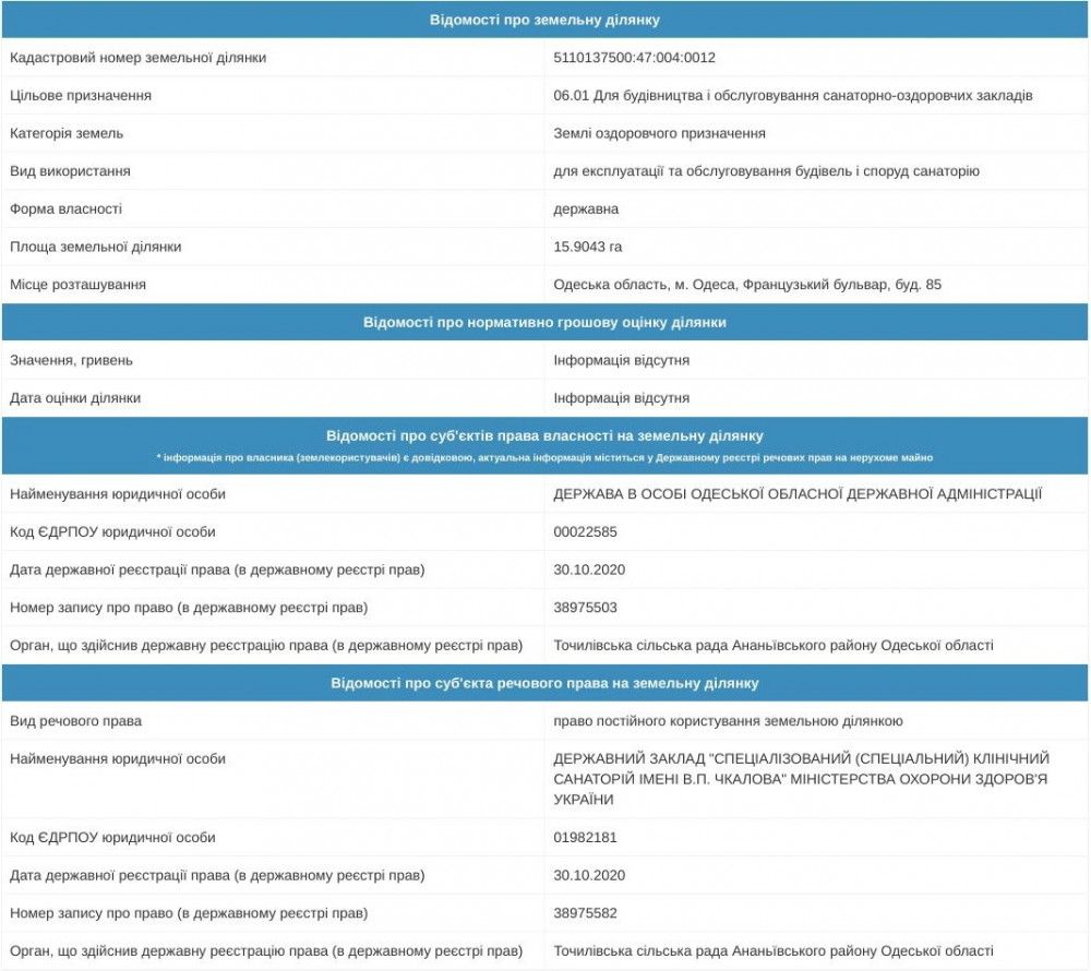 В октябре 2020 года территория санатория перешла в государственную собственность (что характерно, публично об этом не сообщалось). Землей стала распоряжаться ОГА, а санаторий получил право пользования. Отметим, что регистрацию права собственности осуществил регистратор Точиловского сельсовета Ананьевского района Одесской области.