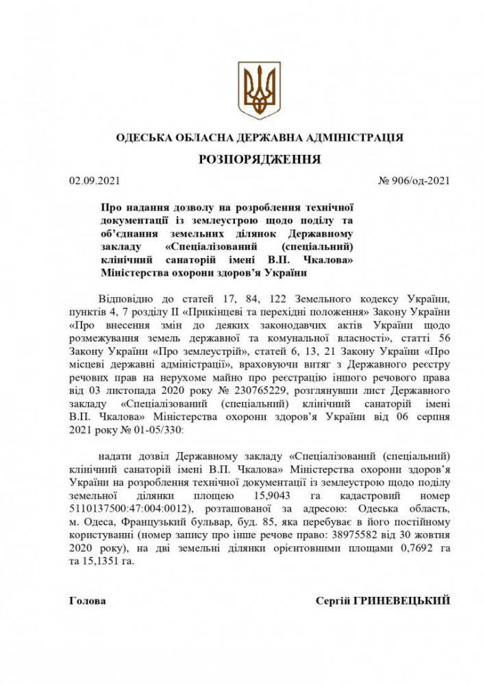 Соответствующее распоряжение подписал глава Одесской областной государственной администрации Сергей Гриневецкий.