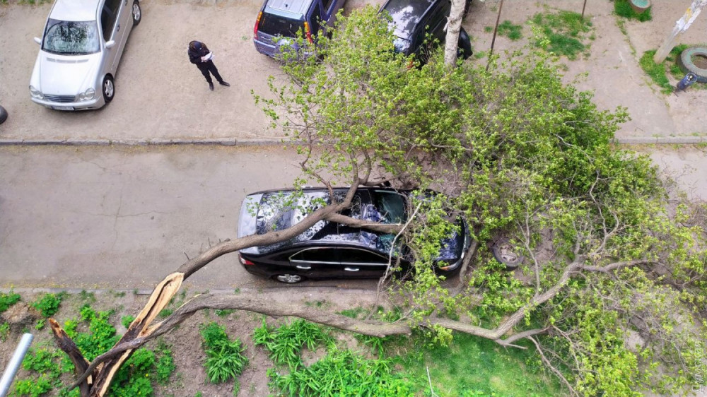 Подгнившее дерево упало сегодня на автомобиль, припаркованный во дворе дома №9 по улице Академика Филатова в Одессе.