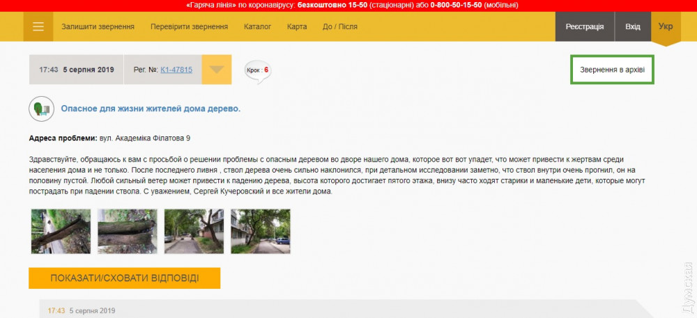 19 сентября одесситы получили ответ от директора КП «ЖКС «Вузовский» Зураба Шонии (уволен в январе 2020 года). Руководитель проинформировал их, что «силами участка выполнен снос дерева».