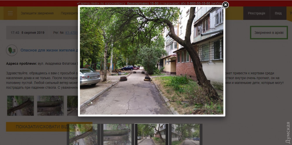 Как рассказали «Думской» жильцы дома, прошлым летом они написали об этом дереве в Единый центр обращений граждан Одесского горсовета (служба 1535):