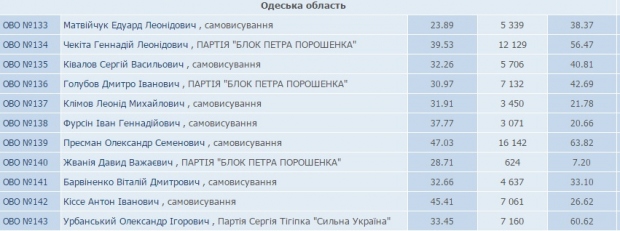 56% протоколов обработано в Малиновском районе Одессы (134 округ). Здесь с большим отрывом побеждает Геннадий Чекита (Блок Петра Порошенко). Он набрал 40%, а его ближайший конкурент Александр Шеремет всего 15%.