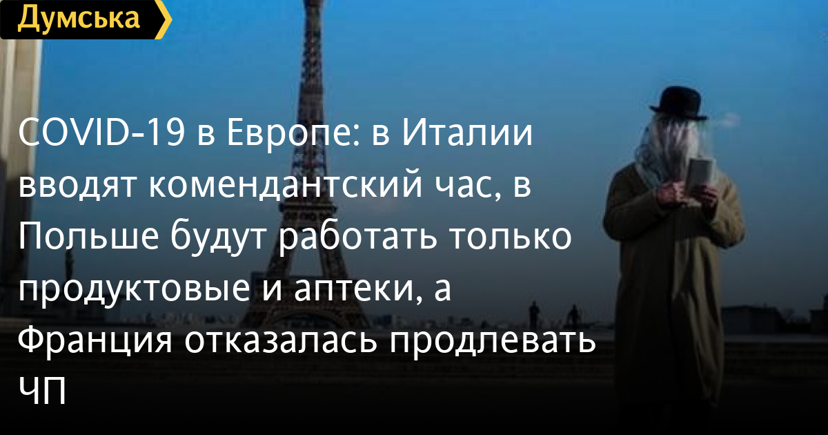 COVID-19 в Европе: в Италии вводят комендантский час, в Польше будут работать только продуктовые и аптеки, а Франция отказалась продлевать ЧППо состоянию на 4 ноября в мире зафиксировано 47 407 204 случая заражения COVID-19. В связи со стремительным ростом количества заболевших страны Европы ужесточают карантинные меры. Польша Власти Польши заявили о введении новых ограничений в стране после того, как в среду было подтверждено почти 25 тысяч новых случаев заражения коронавирусом. В связи с этим с 7 ноября до 29 ноября в стране вводятся новые ограничения: кинотеатры, театры, галереи и учреждения культуры будут закрыты, отели будут принимать только гостей, находящихся в командировке. В торговых центрах будут закрыты большинство магазинов, работать будут только продуктовые магазины, аптеки. В магазинах площадью менее 100 квадратных метров будет допускаться 1 покупатель на 10 квадратных метров, в больших магазинах — 1 покупатель на 15 квадратных метров. Ученики 1-3 классов переходят на онлайн-обучение, одновременно для старшеклассников дистанционное обучение продолжается до конца ноября. Италия Правительство Италии также сегодня приняло решение об усилении карантина на всей территории страны с введением комендантского часа. Новые ограничения вводятся на период с 5 ноября по 3 декабря, сообщает Corrieredella Sera. На всей территории Италии с 10:00 будет действовать комендантский час. После этого времени все, кто выходит на улицу, должны иметь подтверждение причины. Музеи, игорные залы закрываются, бары и рестораны должны будут работать только до 18 часов. Торговые центры должны будут закрываться в выходные и предпраздничные дни, а в выходные будет разрешено работать только продуктовым магазинам, аптекам, торговцам сигаретами и прессой. Устанавливается ограничение заполненности общественного транспорта на 50% - как городского, так и регионального. Старшая и высшая школа переходит на дистанционное обучение. Средняя начальная школа продолжит обучение в классах, но в масках. Детсады закрываются. Германия Со вчерашнего дня Германия ужесточила карантинные ограничения. Со 2 ноября в стране перестают работать рестораны, бары, развлекательные заведения, ограничивается работа магазинов. В общественных местах запрещено собираться в компаниях более десяти человек. Также до декабря не будут работать фитнес-клубы, бассейны, косметические и массажные студии, тату-салоны. Отелям запрещено принимать туристов. Испания На прошлой неделе испанские парламентарии большинством голосов поддержали инициативу правительства о продлении особого режима на всей территории страны до 9 мая 2021 года. Особым режимом в частности предусмотрен комендантский час с 23:00 до 6:00 местного времени, ограничения на социальные контакты, на местном уровне может быть ограничено передвижение. Кроме того, местные власти имеют право регулировать сроки действия комендантского часа. До 24 ноября в Испании запрещена работа спортзалов, общественных бассейнов, кинотеатров и театров. Кроме того, прекращается работа всех точек общественного питания, включая бары, рестораны и кафе после 18:00. Правительство страны планирует направить два миллиарда евро на поддержку этого бизнеса. При этом исключение продолжает действовать только для Канарских островов — это необходимо для поддержки туристической отра