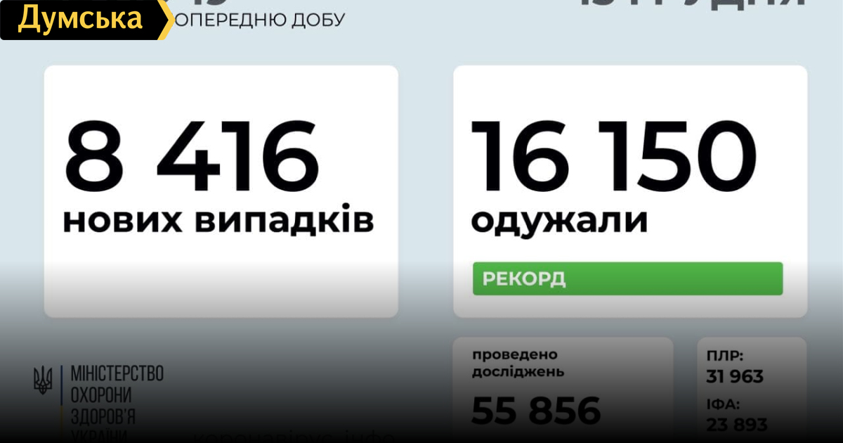 COVID-19 в Украине: фиксируют 8416 новых случаев заражения, выздоровевших — в два раза большеПо состоянию на 15 декабря 2020 года 8416 новых случаев коронавирусной болезни COVID-19 зафиксировано в Украине. В частности, заболели 412 детей и 447 медработников. За сутки госпитализированы — 1479 человек; летальных случаев — 233; выздоровели — 16150 человек, а это рекорд на сегодняшний день. Всего за все время пандемии в Украине заболели – 909 082 человека; выздоровели — 522 868 человек; летальных случаев — 15480; проведено ПЦР-тестов – 5 084 649. За последние сутки наибольшее количество подтвержденных случаев зарегистрировано в Киеве (1559), Одесской (830), Черкасской (665), Запорожской (599) и Полтавской (575) областях. СМЕРТЬ РОСІЙСЬКИМ ОКУПАНТАМ! Помітили помилку? Виділяйте слова з помилкою та натискайте control-enter Новини по цій темі: 4 березня 2023: "Вакцини-довгожителі", або Як щеплення проти COVID-19 перетворилися в Україні на небезпечний ритуал 27 січня 2023: МОЗ зобов`язали опублікувати договори на закупівлю вакцин проти COVID-19: апеляційний суд задовольнив позов журналіста "Думської" 11 січня 2023: За тиждень в Одесі зафіксовано 159 випадків ковіду 4 січня 2023: За тиждень в Одесі зареєстровано 113 випадків ковіду |