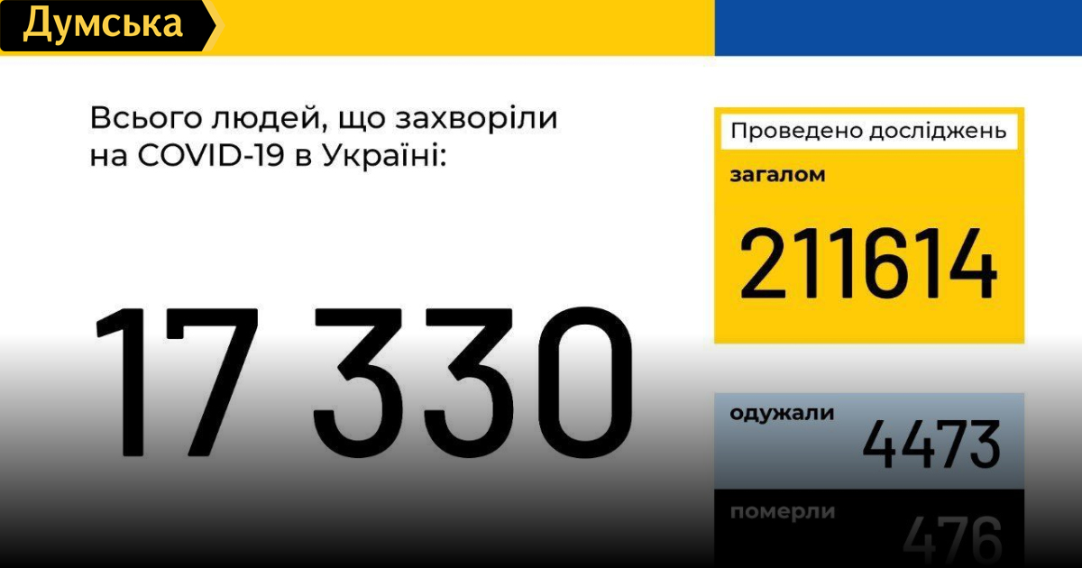 По состоянию на 9:00 15 мая в Украине 17330 лабораторно подтвержденных случаев COVID-19, из них 476 летальных, 4473 пациента выздоровели.