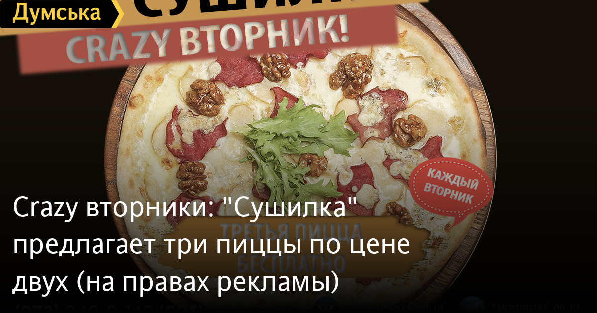 Crazy вторники: «Сушилка» предлагает три пиццы по цене двух (на правах рекламы)Со следующей недели служба доставки еды «Сушилка» вводит новую постоянную акцию «Crazy вторник». Так, каждый вторник при заказе двух пицц третью клиент получает в подарок! Таким образом, при заказе, к примеру, двух пицц «Диабло» и «4 мяса» вы можете получить «4 сыра» совершенно бесплатно. При этом в случае если вы заказываете одну пиццу, то на вторую получаете 50% скидку. Акция распространяется на пиццы всех доступных размеров. Также обращаем ваше внимание на то, что скидка будет применяться на пиццу с меньшей стоимостью. Напомним, чуть больше недели назад «Сушилка» расширила меню, добавив множество роллов, ввела новые запеченные роллы, гунканы, пиццы и салаты. Заказ можно сделать на сайте sushilka.od.ua или по телефонам: 073-240-0-140; 095-240-0-140; 096-240-0-140; 048-735-29-99. СМЕРТЬ РОССИЙСКИМ ОККУПАНТАМ! Заметили ошибку? Выделяйте слова с ошибкой и нажимайте control-enter |