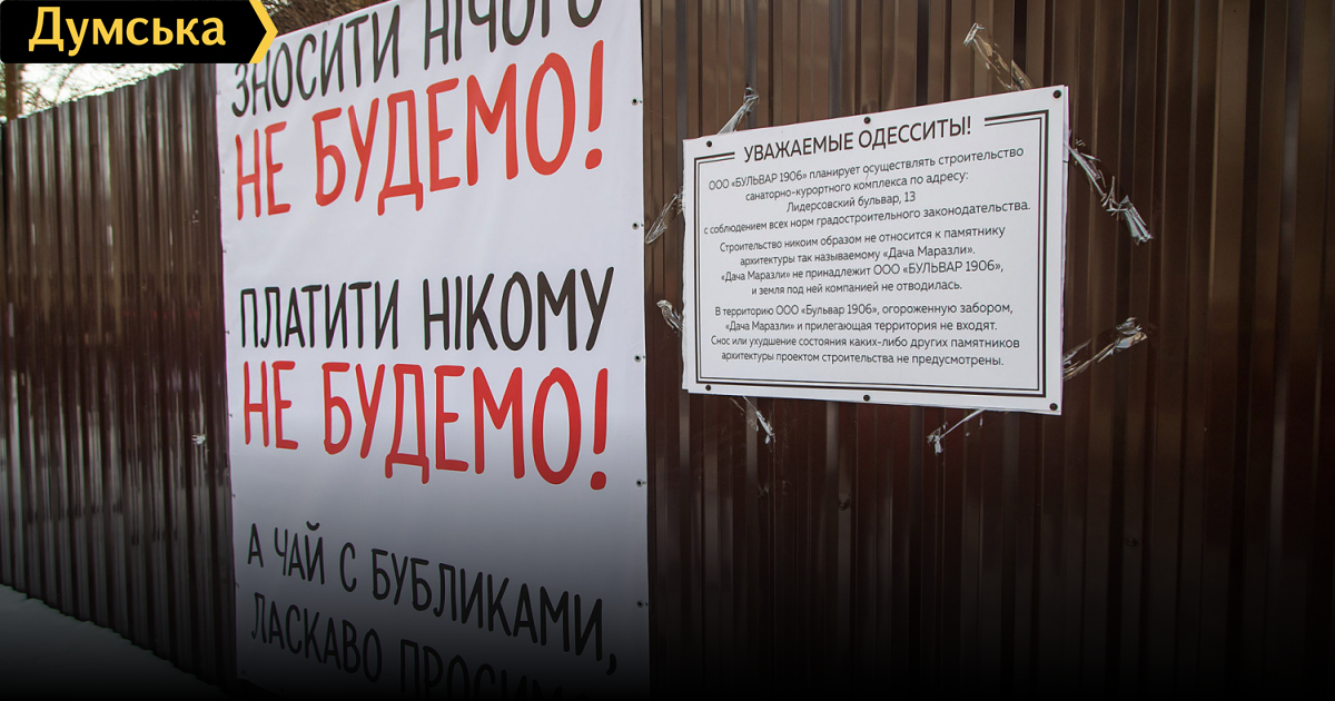 «В связи с появлением в СМИ и социальных сетях недостоверной информации о ситуации со строительством на Лидерсовском бульваре возле объекта так называемой «Дачи Маразли», а также распространением фейковых данных среди общественности города, наша компания, которая является законным владельцем всех строений, находящихся на данной территории кроме «Дачи Маразли», настоящим письмом сообщает официальную позицию по данному вопросу.
